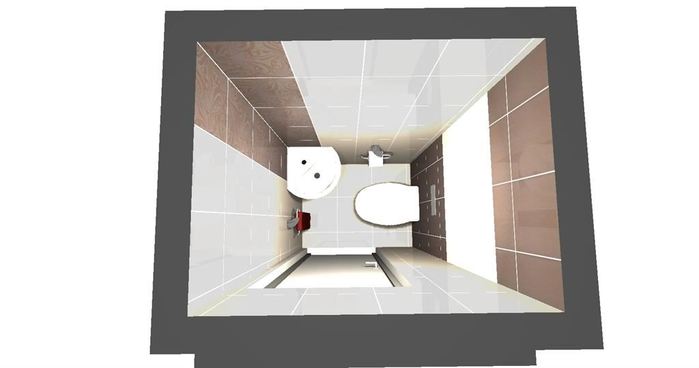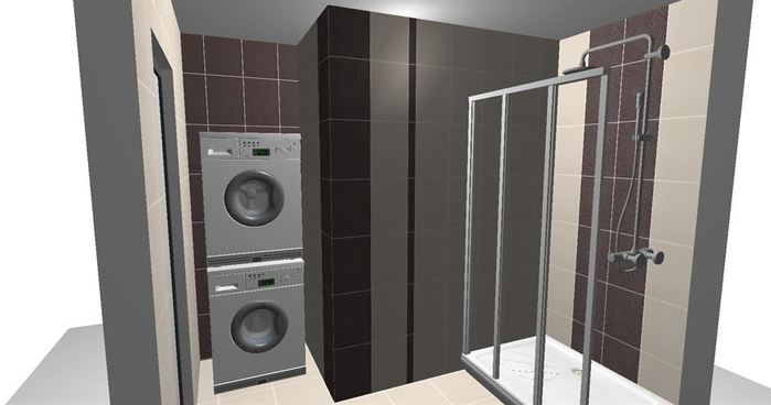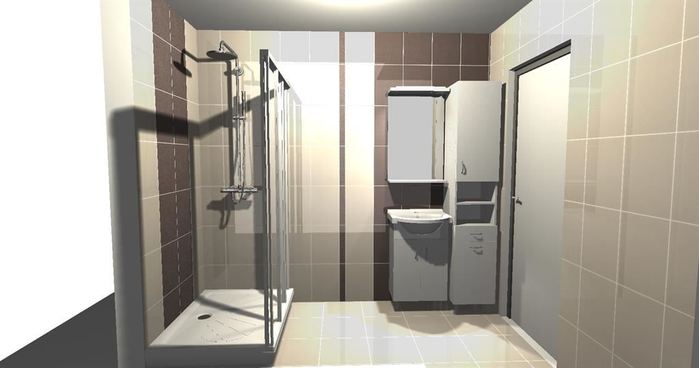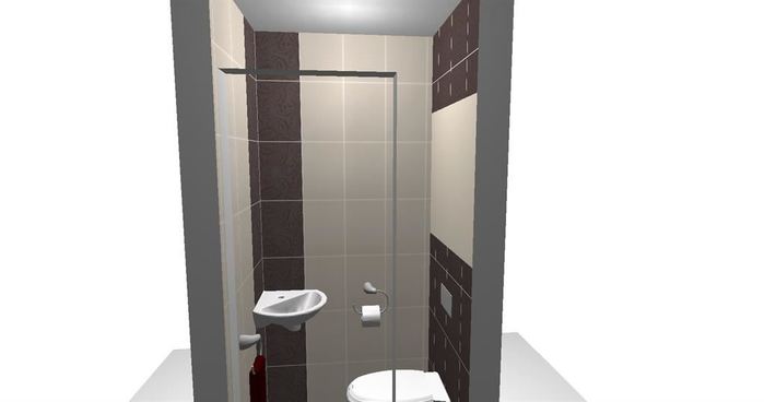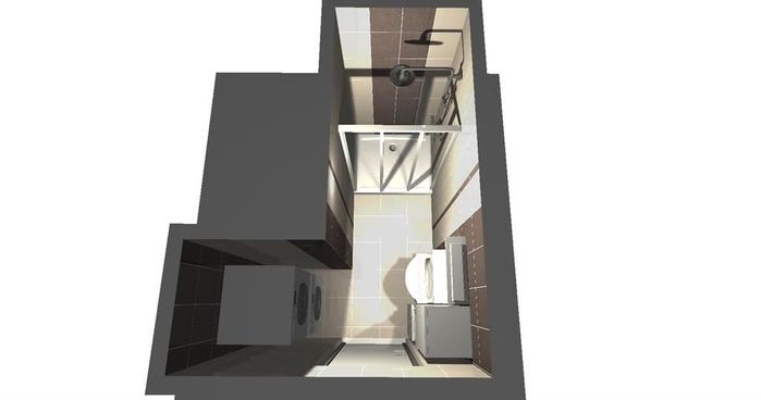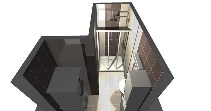 Tento 3D návrh je návrhem rekonstrukce koupelny a WC - bytové jádro v bytě 3+1. Realizace proběhla v Třebíči na ulici Modřínová. Koupelna je navržena tak, aby mohl být v koupelně sprchový kout 100x100 a sušička s pračkou o rozměrech 60x60. Díky tomuto provedení získal investor prostornou rohovou kuchyň.