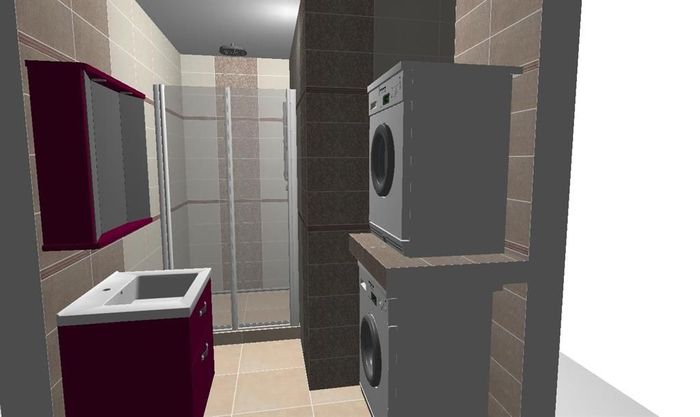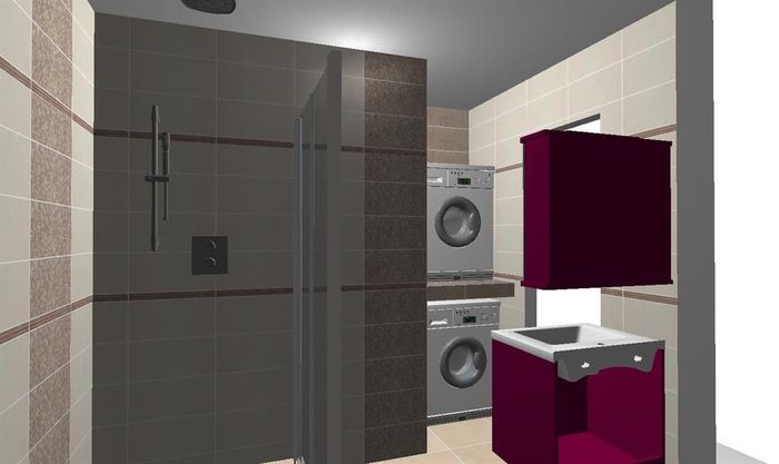 Vizualizace k rekonstrukci bytového jádra v panelovém domě. Použitý obklad od firmy Rako. Pod sušičku je plánovaná obložená deska, protože pračku a sušičku nemá zákazník od stejné firmy. Na wc bude instalována konstrukce od Geberitu. Koupelnový nabytek bude osazen od výrobce Dřevojas.
