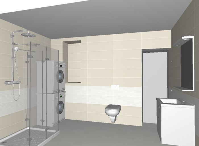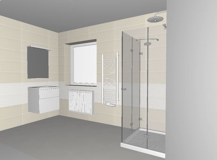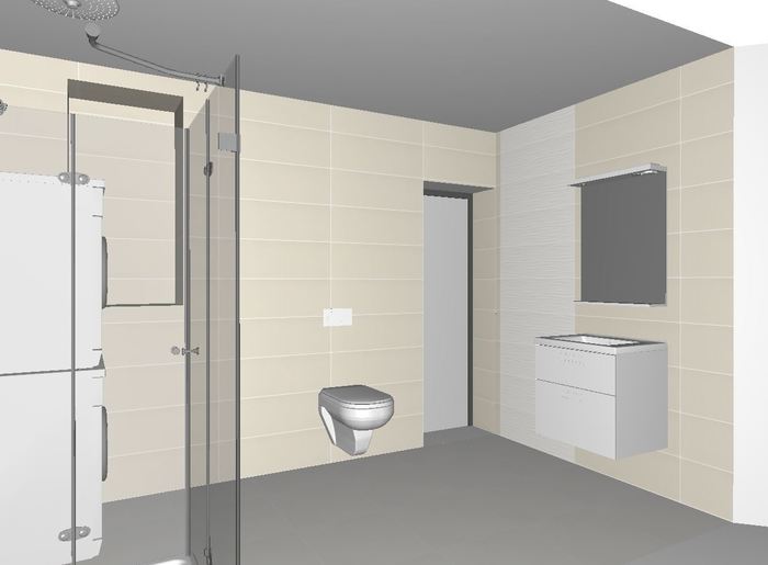 Pro zákazníka jsme vypracovávali vizualizaci koupelny v 2NP rodinného. Vizualizace je ve dvou verzích z obkladu Elanda. Dekorativní pruhy jsou provedena z Elada bílý dekor - struktura.