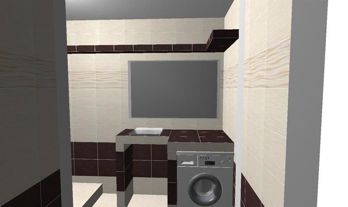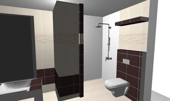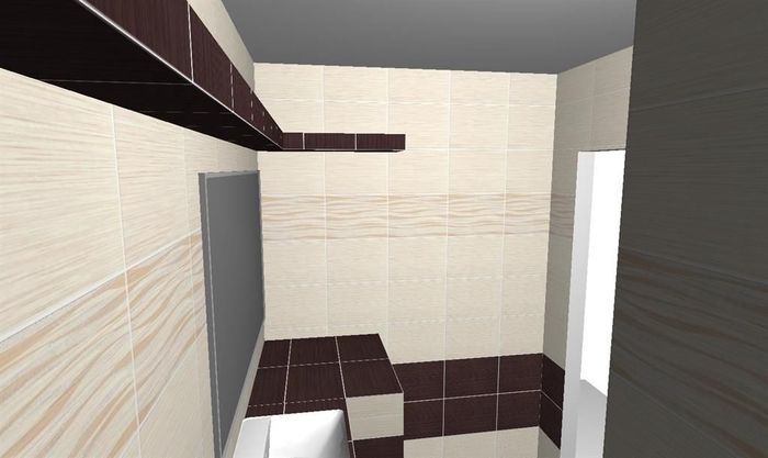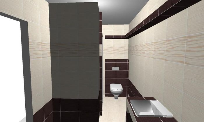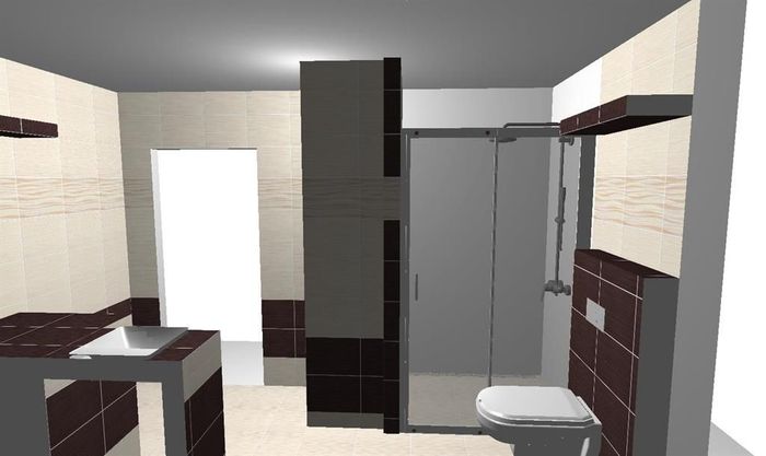 3D návrh rekonstrukce bytového jádra v bytě 3+1. Bytové jádro je spojeno s WC a je kompletně rozšířeno a změnili jsme i místa osazení zařizovacích předmětů. V prostoru WC a sprchového koutu je kompletně zvednutá podlaha. Sprchový kout bude při realizaci obložen lakovaným sklem.