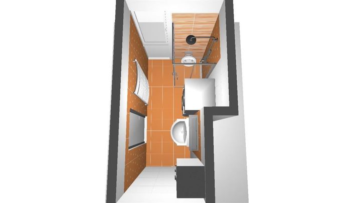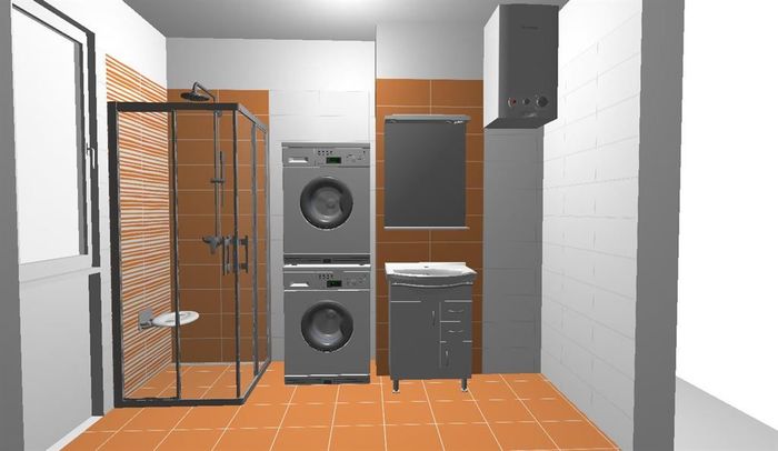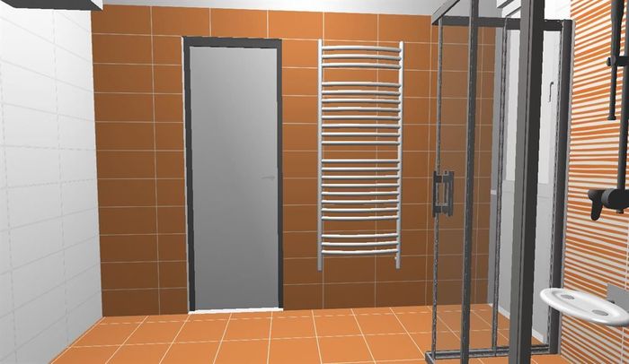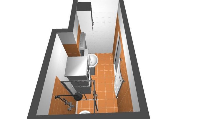 3D návrh koupelny v cihlovém bytovém domě. Součástí koupelny je nová vodoinstalace, odpady a elektroinstalace. Původní koupelna je s plechovou vanou, karmou a plynovým topidlem. V nové koupelně je elektrický bojler místo původní plynové karmy.
