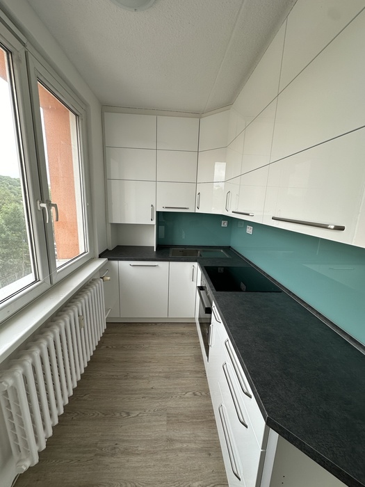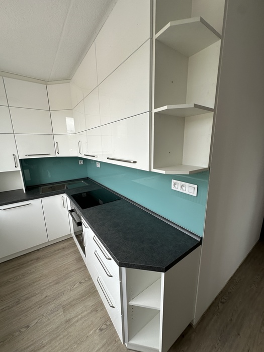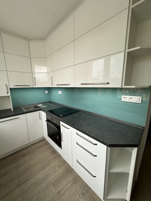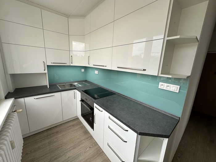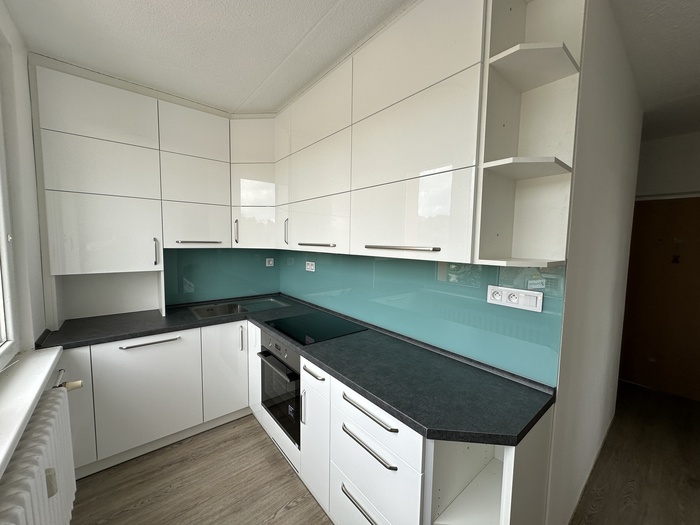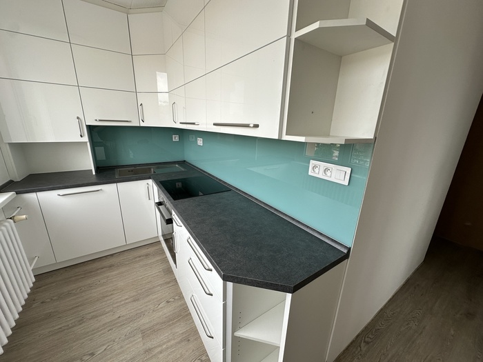 V Třebíči v panelovém bytě 2+1 jsme po naší rekonstrukcí bytového jádra prováděli montáž lakovaného skla do nové kuchyně.