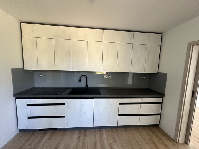 Montáží lakovaného skla (obkladu pracovní plochy kuchyně) dokončujeme rekonstrukci interiéru bytu 3+1 na klíč.