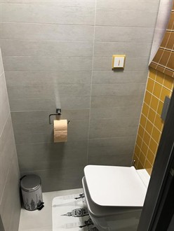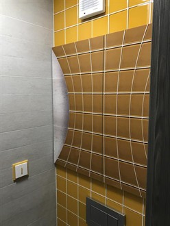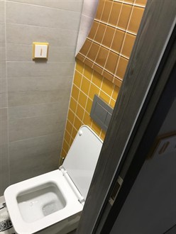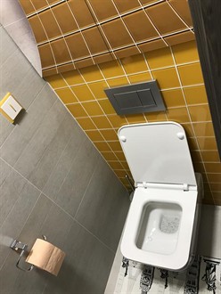 Do nové rekonstrukce bytového jádra jsme na přání zákazníka prováděli dodatečnou výměnu WC za moderní hranaté WC s pomalu sklopným sedátkem. Závěsné WC je usazeno na konstrukci od firmy Geberit. Nad WC konstrukcí se nachází velice zajímavě a moderně vyřešena dvířka do stoupačky s fototapetou.