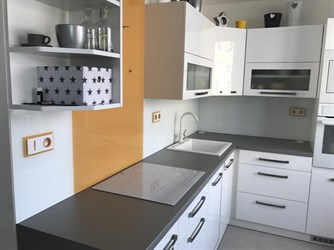 Do nové kuchyně jsme provedli montáž dvoubarevného lakovaného skla.