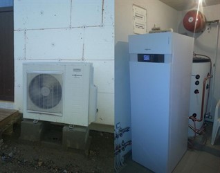 Do novostavby rodinného domu jsme prováděli dodávku a montáž tepelného čerpadla od Německého výrobce Viessamann - Vitocal 222. Toto TČ má výkon 5,6 kW a jde o systém vzduch/voda (venkovní jednotka odebírá teplo z venkovního vzduchu / vnitřní systém topení je vodní). Součástí TČ je vestavěný elektrokotel - bivalentní zdroj. Toto čerpadlo je vybaveno také klimatizací. Chlazení lze použít i s podlahovým vytápěním. Součástí vnitřní jednotky je 160 L bojler. Tepelné čerpadlo je napojeno na 300L výměník, který je namontován pro zvýšení životnost kompresoru TČ. V novostavbě RD je podlahové topení, které ideální pro tepelný zdroj jako je tepelné čerpadlo.