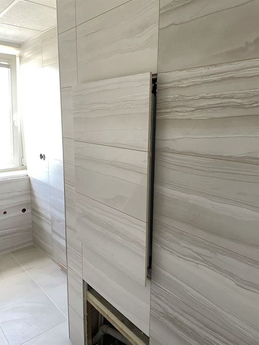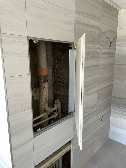 Ve zděném činžovním domě jsme prováděli kompletní rekonstrukci koupelny a WC. Mimo jiné byla součástí této rekonstrukce montáž skrytých (neviditelných) dvířek do stoupaček a skrytý vstup do stoupačky za klozetem.