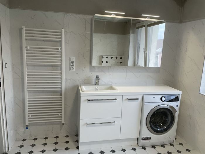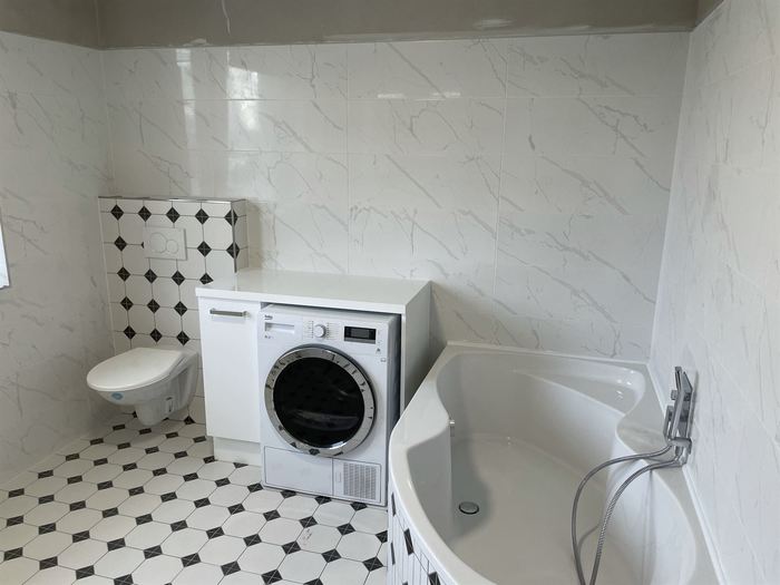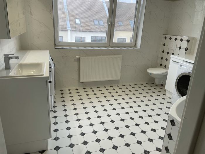 V rámci rekonstrukce RD jsme prováděli v 3NP renovaci koupelny. Koupelna je osazena vanou Rosa, bateriemi Novaservis a koupelnovým nábytkem Krajcar. Prováděli jsme renovaci vody, topení a elektroinstalace. Zednické a obkladačské práce včetně matriálů.