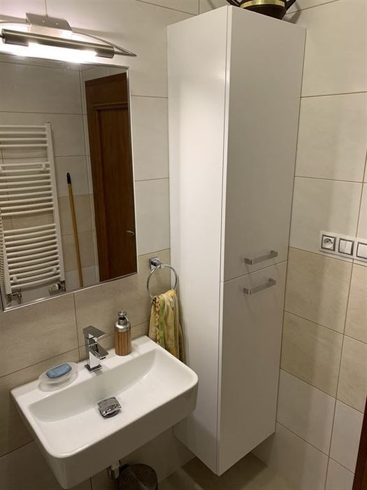 Původní instalace této koupelny byly zachovány včetně konstrukce závěsného WC s tlačítkem a jeho obezdívka. Osadili jsme nově závěsný klozet se splachováním RIMLES a sedátkem SOFTCLOSE. Koupelna byla nově osazena vodovodními bateriemi od NOVASERVISU. Nově bylo usazeno moderní obdélníkové umyvadlo s koupelnovým nábytkem a zrcadlem od výrobce KRAJCAR.