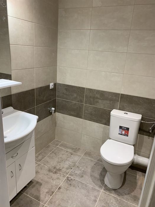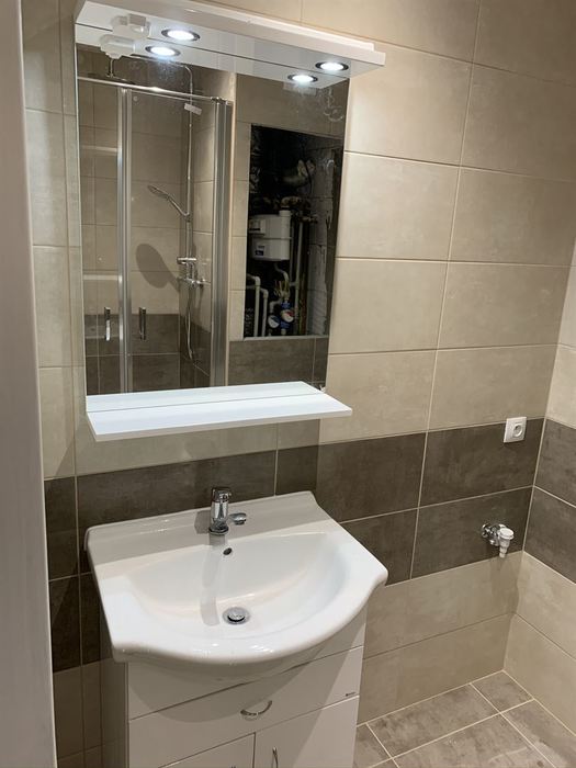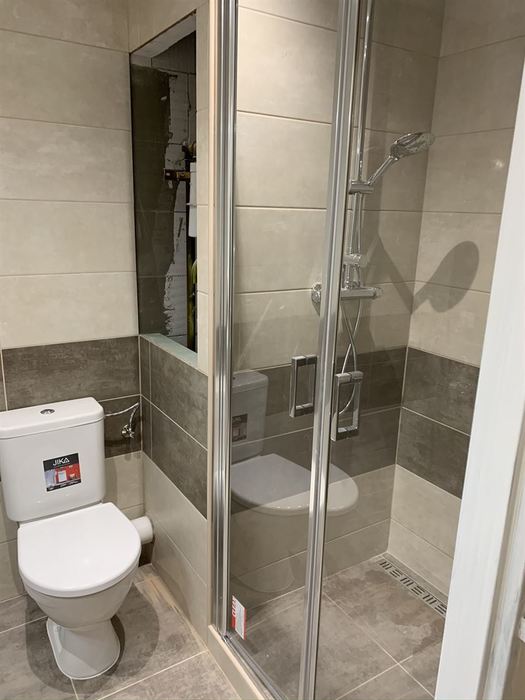 V bytě 1+1 jsme odstranili původní bytové jádro a postavili nové zděné jádro se sprchovým koutem, zděnou vaničkou a odtokovým žlabem. Koupelnu jsme dále osadili novým umyvadlem s nábytkem, zrcadlem s osvětlením, vodovodními bateriemi a WC kombi. Příprava pro novou kuchyň.