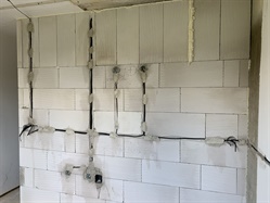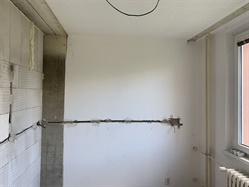 Po demolici a vyzdění nového bytového jádra provádíme rozvody vodoinstalace a elektroinstalace jak pro koupelnu tak pro budoucí novou kuchyň. Pro pracovní linku je provedena příprava elektroinstalace bez instalačních krabic, protože v nové kuchyni bude nainstalována jako obklad pracovní deska.