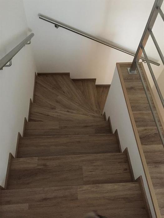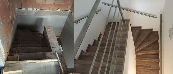 V novostavbě ŘR domu jsme prováděli na klíč vybetonování a montáž schodišťového tělesa. Těleso je armované ocelovými pruty, ze spodní strany podšalováno a následně zabetonováno do dřevěných šablon. Po vyzrání, zednickém zapravení a po výmalbě domu byla provedena montáž vinylového obkladu, který byl po zaměření vyroben na míru.