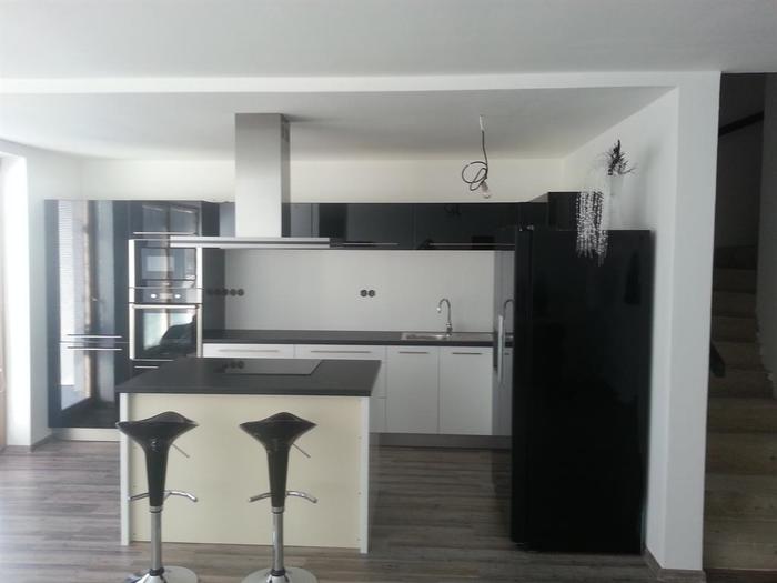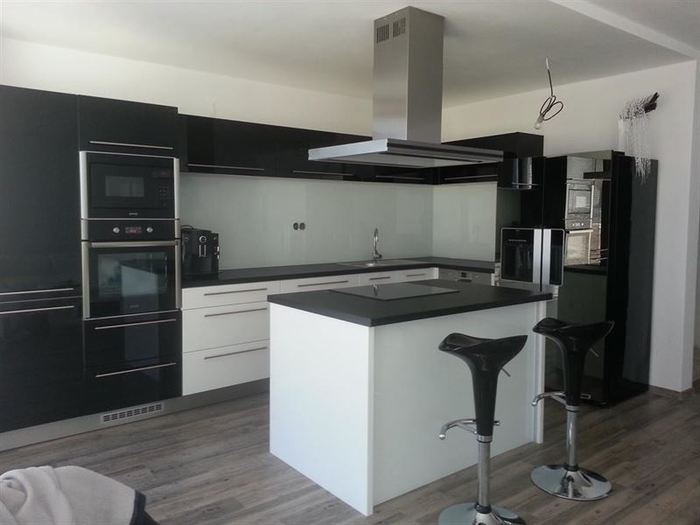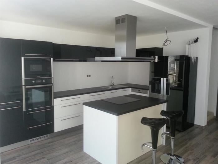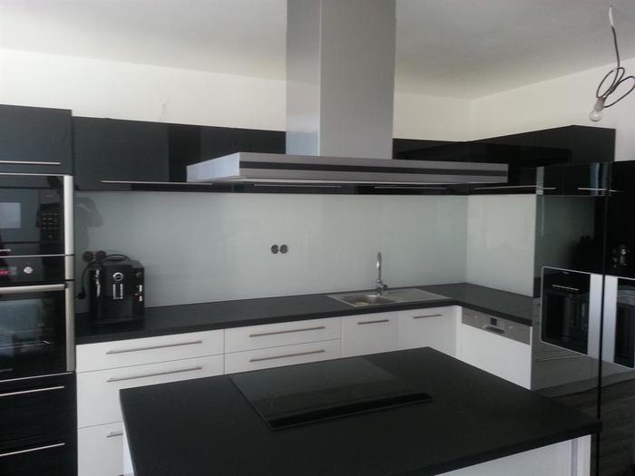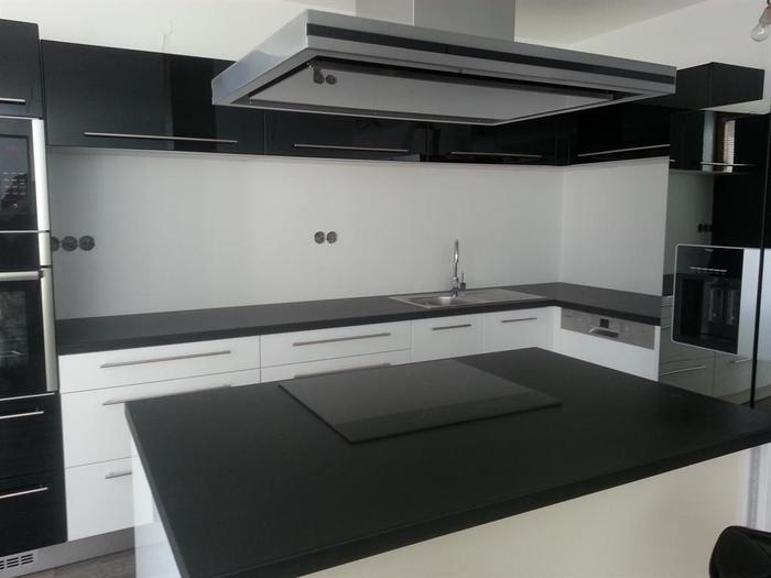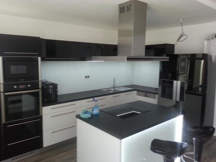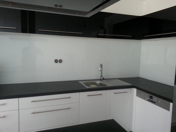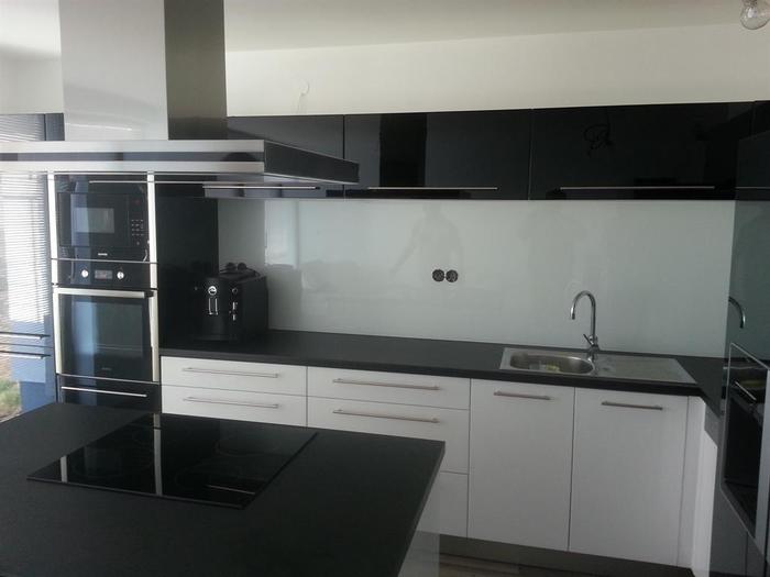 Při kompletní dodávce novostavby na klíč v Třebíči jsme prováděli montáž lakovaného skla vyrobeného na míru za kuchyňskou linku a na ostrůvek s varným centrem. Lakované sklo je 6mm, kalené a čiré. Barva skla je bílá stejně jako barva dvířek lakované kuchyně, kterou jsme také v rámci stavby subdodávkou dodávali. Dále jsme prováděli veškeré práce spojené s montáží a zapojením linky a spotřebičů. Pro odsavač par jsme museli namontovat snížený strop, do kterého jsme osadili vzduchotechniku.