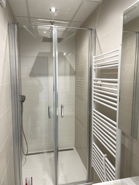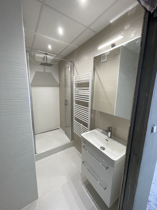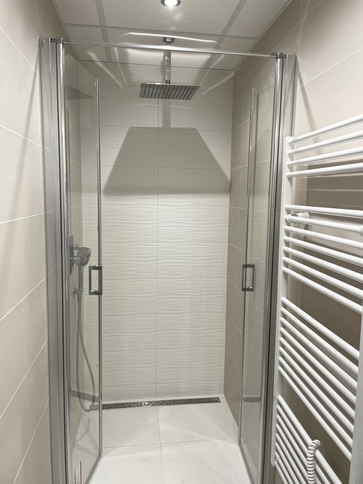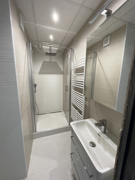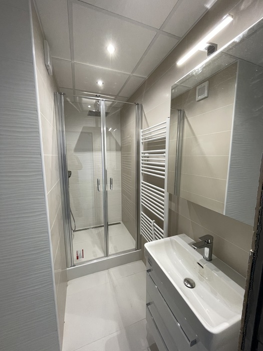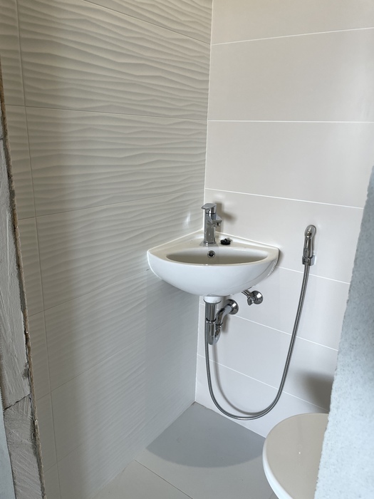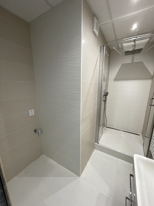 V bytě 2+1 v Třebíči jsme prováděli rekonstrukci bytového jádra na klíč. Nové bytové jádro má změněnou pozici tak, aby vznikl sprchový kout 100x100 cm s odtokovým žlabem a sprchovými dveřmi v provedení lítačky. Koupelnu jsme nově vyzdili z Ytongových cihel. Do toalety, která je na původním místě, jsme osadili závěsné wc Geberit a rohové umyvátko s bidetovou baterií. V koupelně i wc je osazen snížený strop s LED osvětlením. Prováděli jsme přípravu pro novou kuchyň.