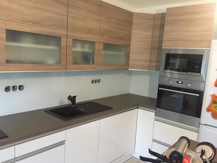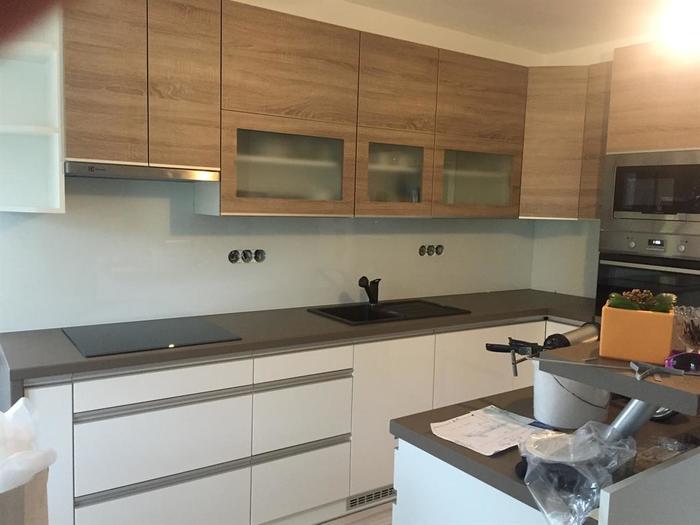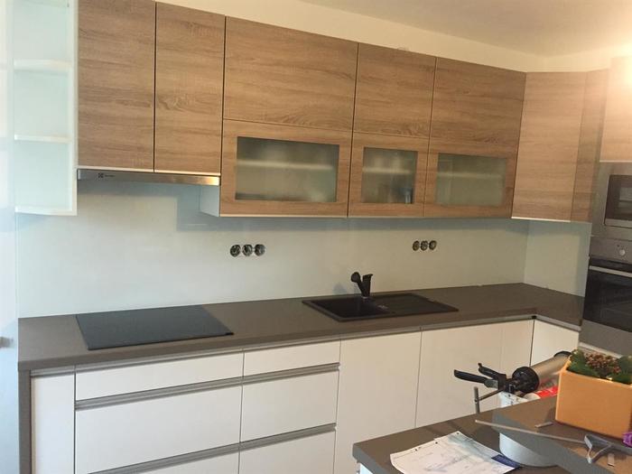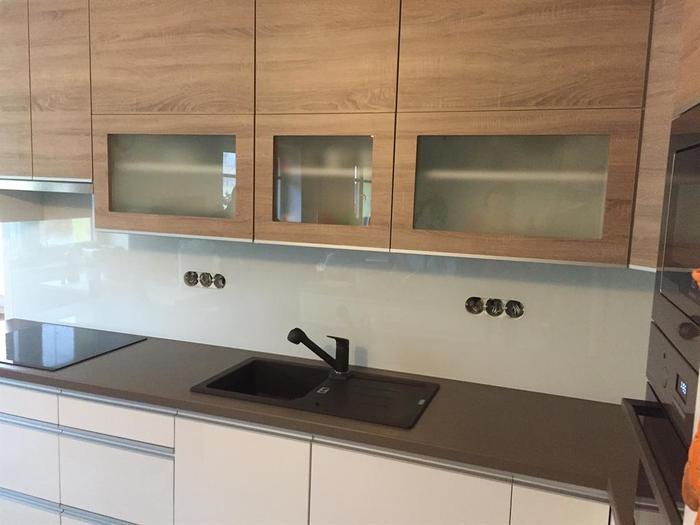 Do nově namontované kuchyňské linky jsme provedli montáž lakovaného skla. Sklo je zaměřeno na míru a je dle zaměření vyrobeno. Barevný odstín si vybírá zákazník. Sklo je 6 mm silné a kalené. Lakované sklo je velice praktické na údržbu a běžný úklid. Hlavní předností je, že nemá žádné spáry oproti obkladům a nelze chemicky poškodit.