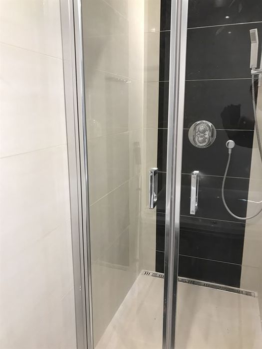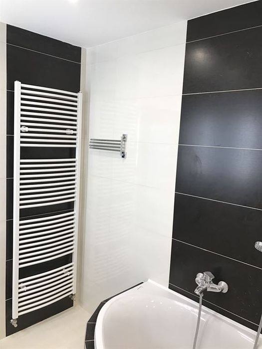 Při rekonstrukci rodinného řadového domu jsme prováděli rekonstrukci koupelen a WC. Tato koupelna se nachází v 3NP. V koupelně je osazena nová masážní vana od firmy Santech. Dále se v koupelně nachází zděný čtvercový sprchový kout s vestavěnou hlavovou sprchou. Je použita sprchová termostatická baterie s příslušenstvím od Novaservisu. Sprchové dveře jsme použili v provedení dvoukřídlé lítačky. Moderní hranatá umyvadla s osvětlenými zrcadly jsou do firmy Krajcar. Umyvadlové baterie jsou vzor 56 od Novaservisu stejně jako baterie vanová. Koupelna je obložena velkoformátovým retifikovaným obkladem Travena/Mogano. Ve třetím MP se také nachází samostatné WC, které je obloženo stejným obkladem a pro WC je požita konstrukce Geberit s tlačítkem Sigma. V koupelně je proveden snížený sádrokartonový podhled do kterého jsou namontována LED bodovky na 12V.