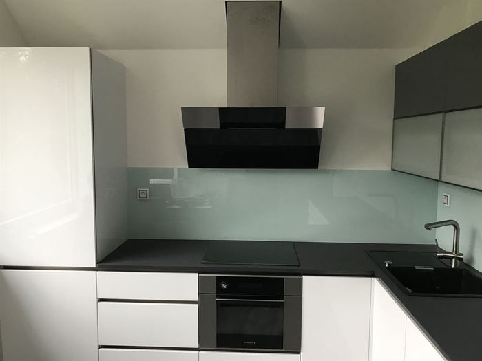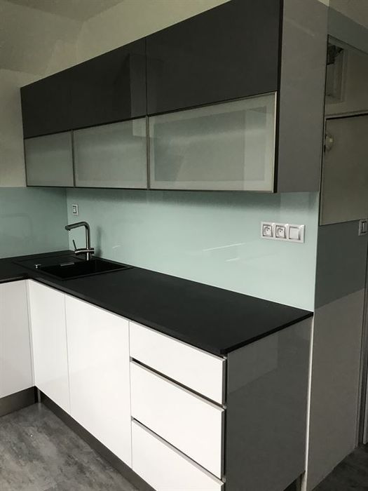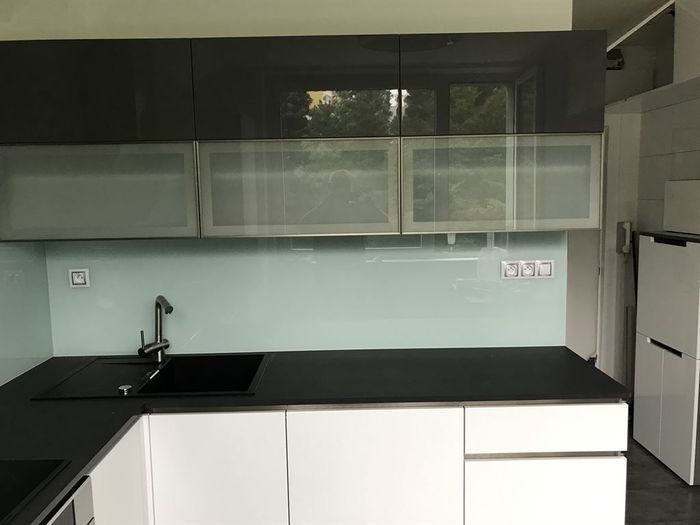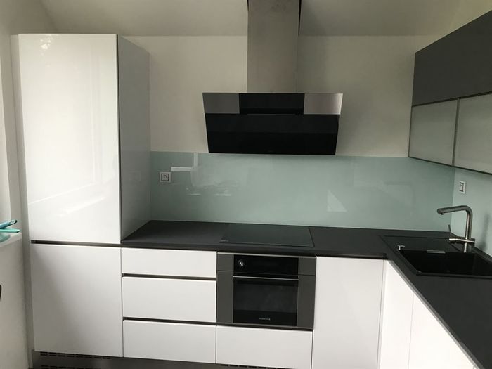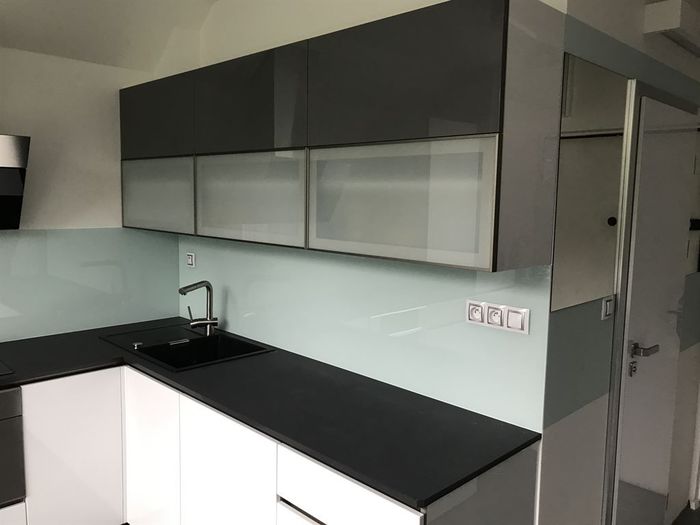 Do bytu po rekonstrukci interiéru a bytového jádra, kterou jsme prováděli, jsme prováděli montáž lakovaného skla. Sklo je kalené o síle 6mm. Zaměření pro výrobu skla jsme provedli po montáži nové kuchyně.