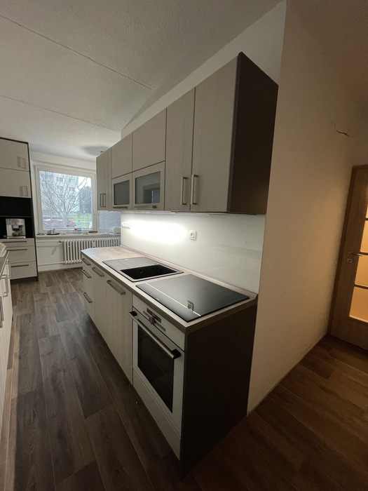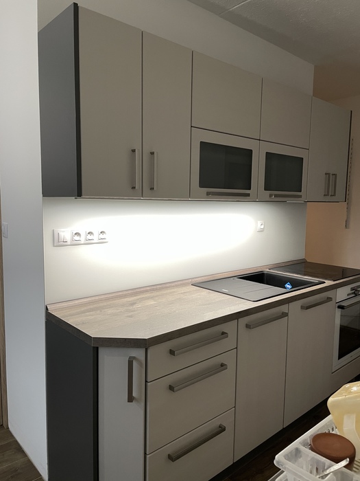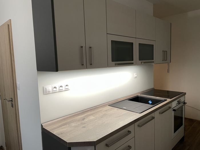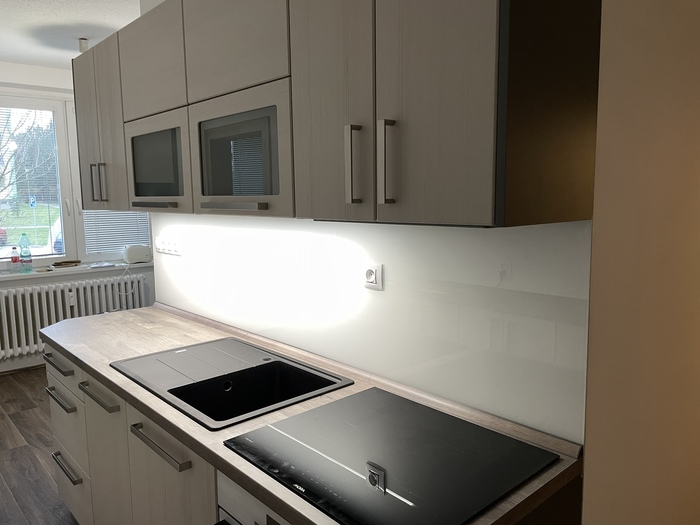 Po naší rekonstrukci bytového jádra jsme prováděli montáž lakovaného skla, které tvoří obklad pracovní plochy kuchyňské linky. Sklo je dle našeho zaměření vyrobeno na míru a následně nalakováno podle výběru barvy zákazníkem. Sklo je o sílo 6mm a je kalené. Hlavní výhodou skleněného obkladu je, že nemá žádné spáry - jednoduchá údržba. Lakovaný skleněný obklad má nadčasový design.