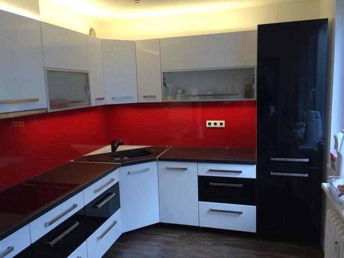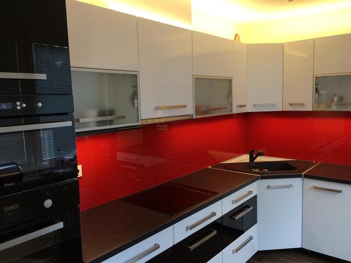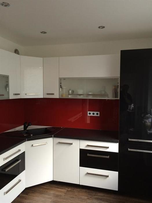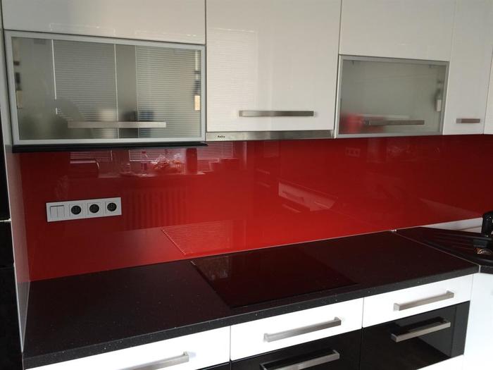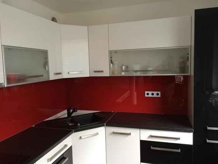 V Třebíči po rekonstrukci bytového jádra v panelovém domě. Po montáži kuchyňské linky jsme provedli zaměření skla do kuchyňské linky. Sklo je vyrobené na míru dle našeho zaměření a nalakované červeně dle výběru zákazníka.