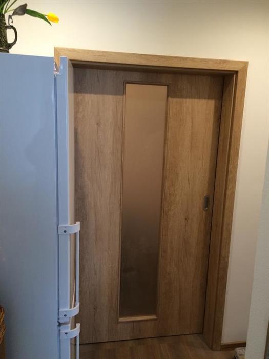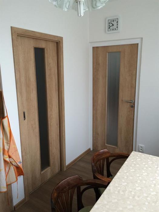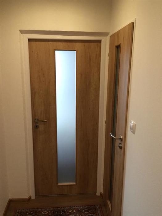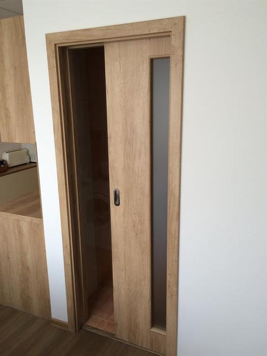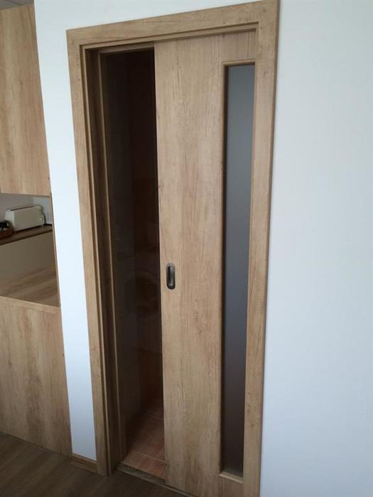V rámci rekonstrukce bytu 2+1 v panelovém domě jsme provedli montáž bytových dveří od firmy Sepos. Posuvné dveře jsou dodány i s obložkou a otočné dveře jsou namontovány do kovových zárubní. Dveře do koupelny jsou v provedení: zajížděcí do pouzdra. Toto pouzdro jsme osadili zároveň s vyzdíváním koupelny. Dveře do chodby jsou v provedení: montáž na garnyž.