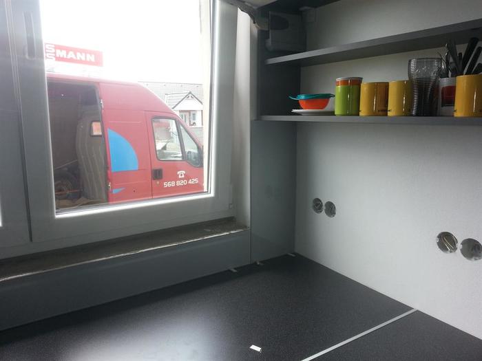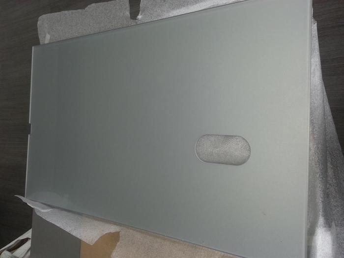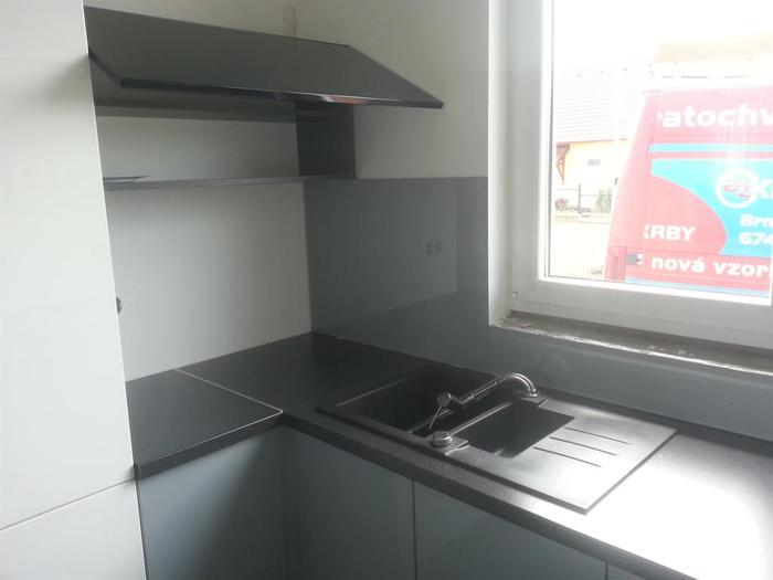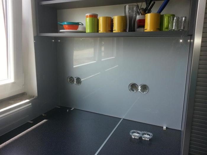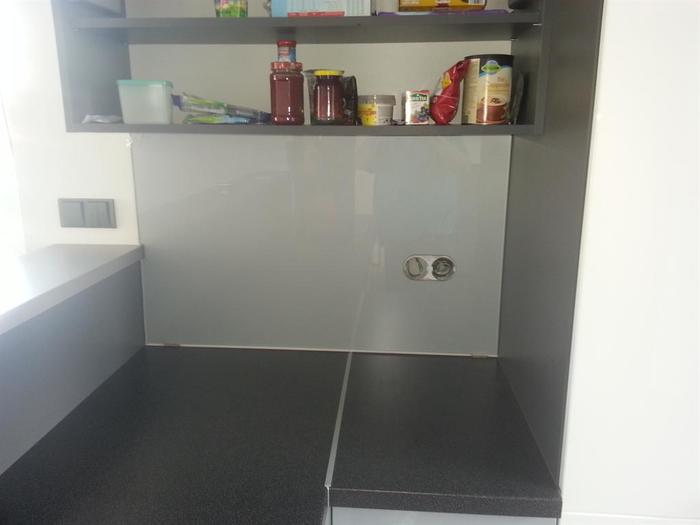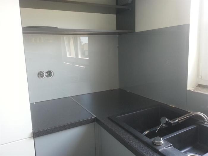 Do novostavby RD jsme dodávali lakované sklo včetně montáže. Sklo je vyrobené na míru dle našeho zaměření. Kuchyňská linka ve tvaru U je v šedo-černé barevné kombinaci a proto se sklo lakovalo dle přání zákazníka stříbrno šedou metalízou. Do skla byly vyrobeny otvory na zásuvky a vypínače dle stávající elektroinstalace.
