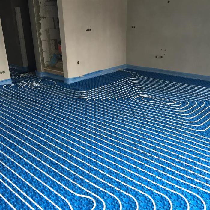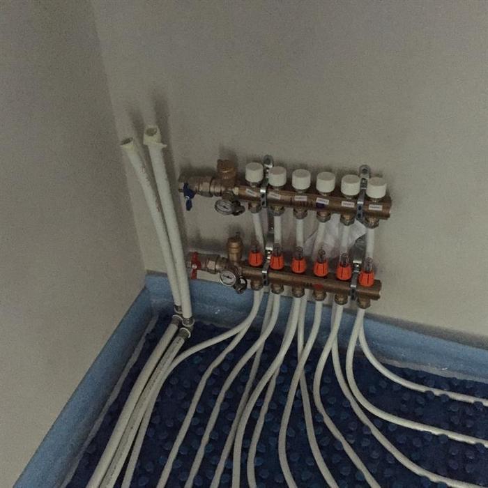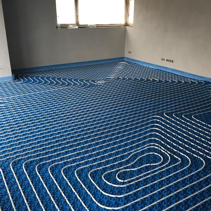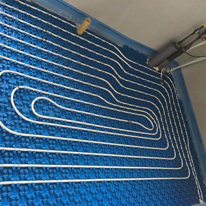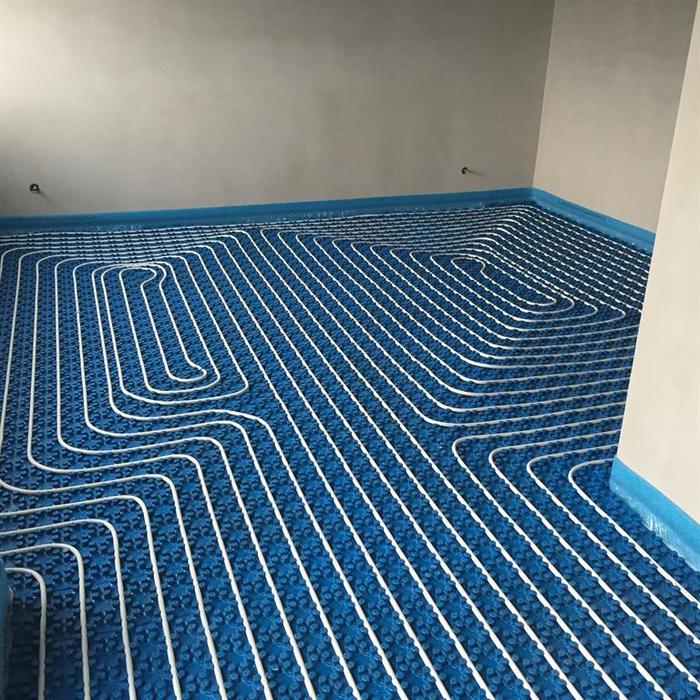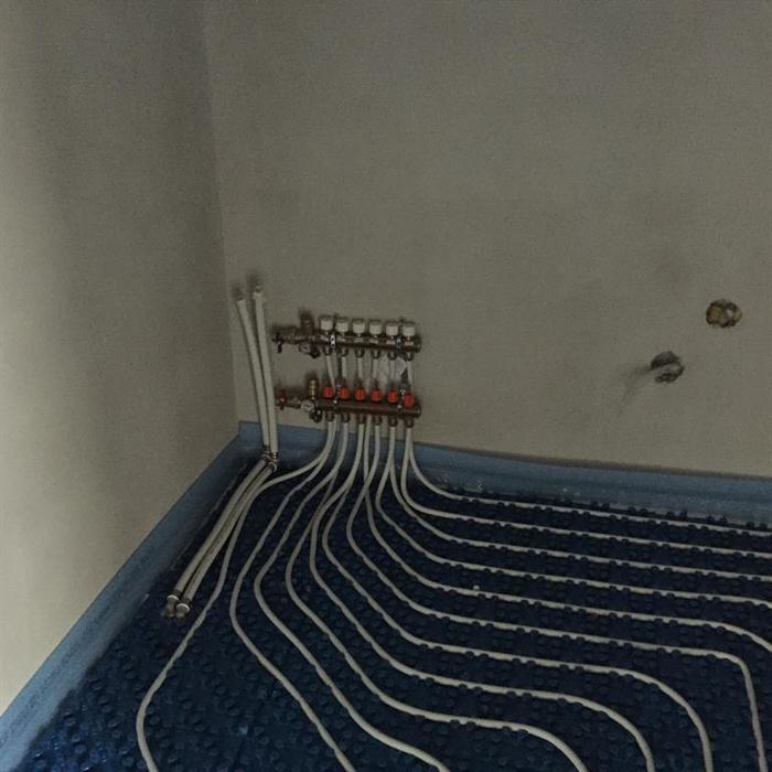 Montáž podlahového vytápění novostavby řadového rodinného domu jsme prováděli v Třebíči. Jedná se o systém s vícevrstvou trubkou. Podlahové topení je napojeno na rozdělovače s průtokoměry. Provedení topení do systémových desek a je připraveno pro vylití anhydridové podlahy.