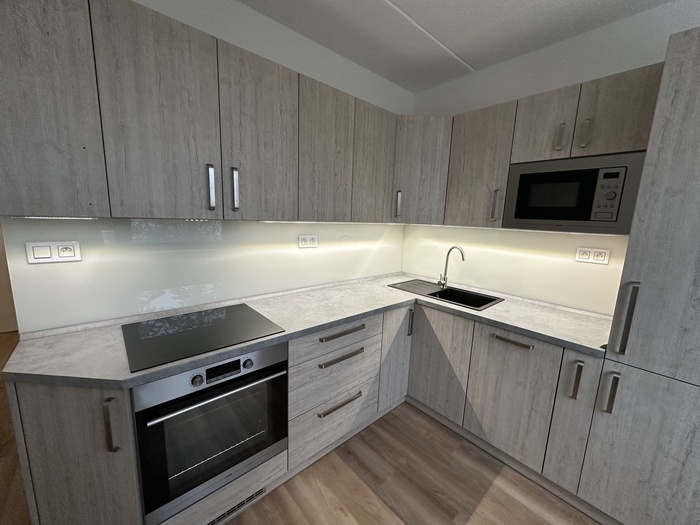 V rámci kompletní rekonstrukce celého bytu 2+1 jsme do nové kuchyně prováděli montáž skleněného obkladu pracovní plochy kuchyně - montáž lakovaného skla. Sklo je kalené a lakované do odstínu dle výběru investora ze vzorníku RAL.