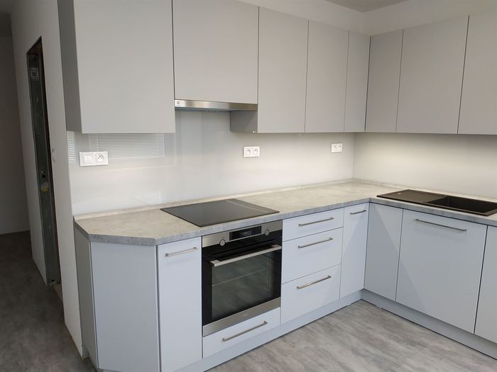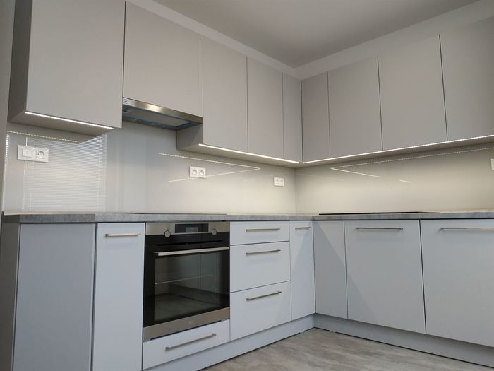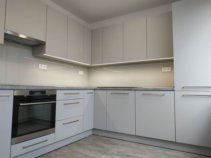 Nová kuchyňská linka a skleněný obklad po rekonstrukci bytového jádra