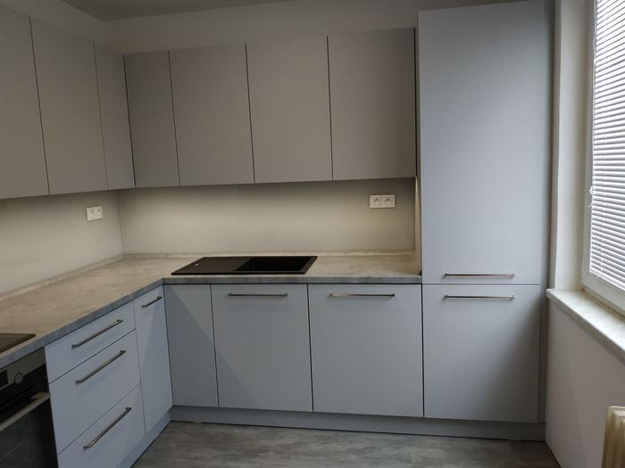 Po naší realizaci rekonstrukce bytového jádra v panelovém domě jsme do nové kuchyně prováděli montáž kaleného skleněného obkladu na míru. Skleněný obklad je vyroben dle našeho zaměření a je v barevném odstínu dle výběru zákazníka.