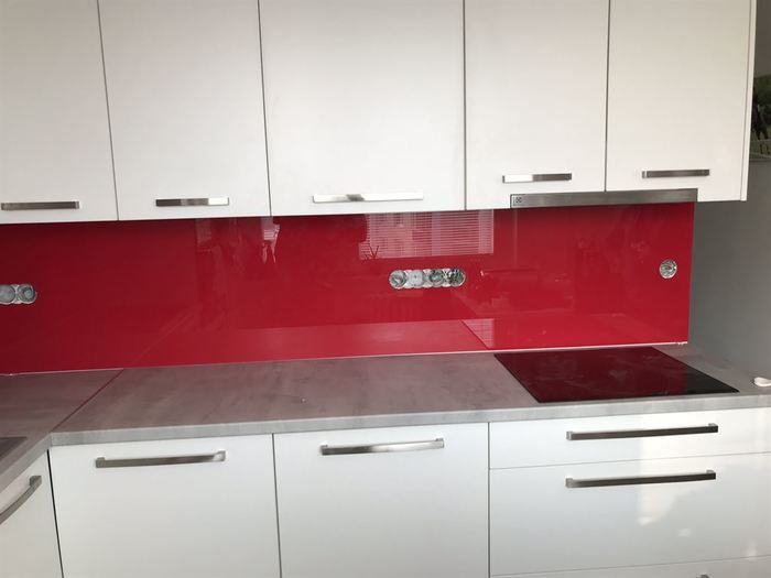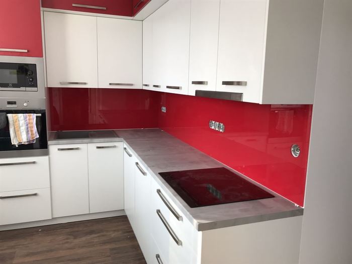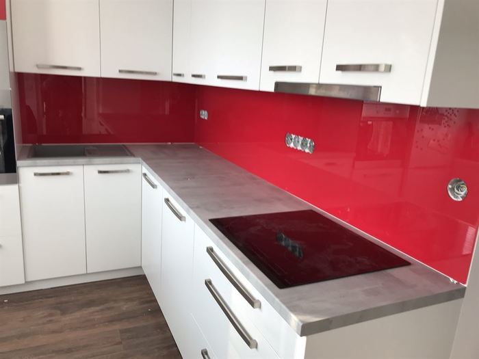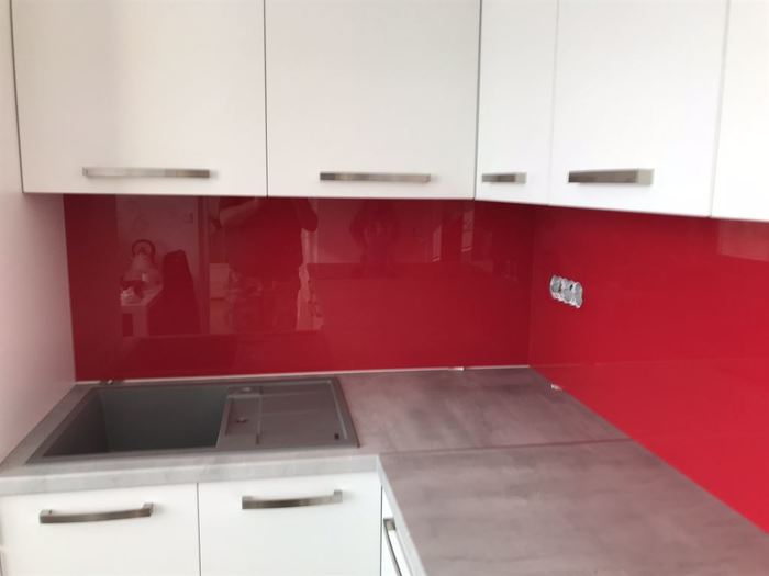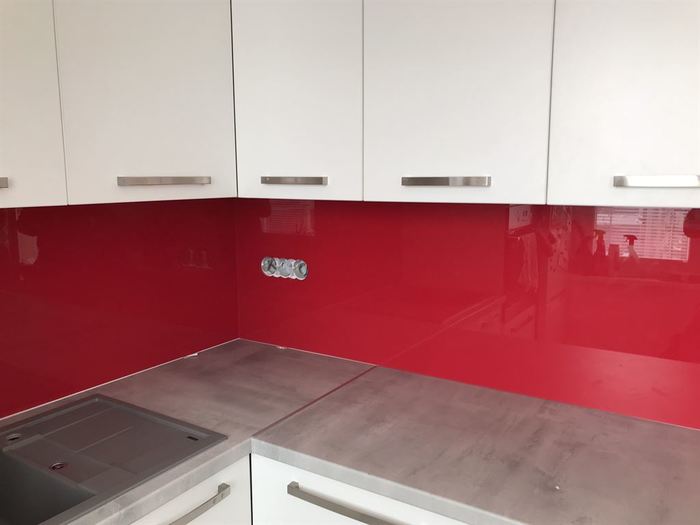 Po rekonstrukci bytového jádra v panelovém domě jsme prováděli montáž lakovaného kaleného skla. Sklo je vyrobeno na míru dle zaměření. Kalený skleněný obklad je o síle 6 mm. Skelněné díly jsou po vyrobení a zakalení nalakovány do odstínu barvy, kterou si zákazník vybere.