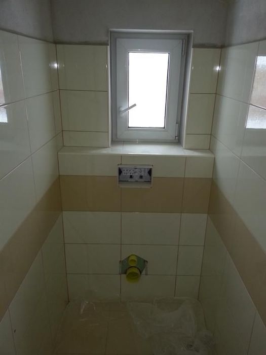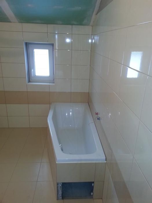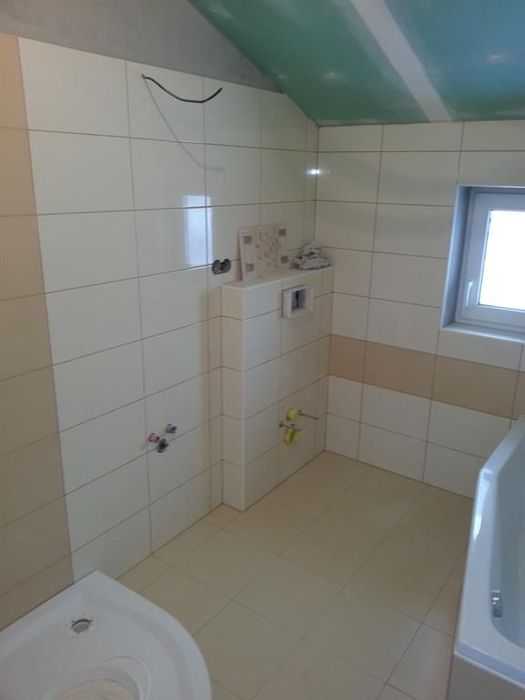 V novostavbě RD jsme prováděli dle objednávky zákazníka pouze obkladačské práce. Koupelnu i WC jsme vyrovnali a připravili pro obkládání. Po usazení vany jsme připravili podezdívku. Koupelnu jsme obkládali námi dodávaným obkladem. Kompletaci koupelny jsme neprováděli.