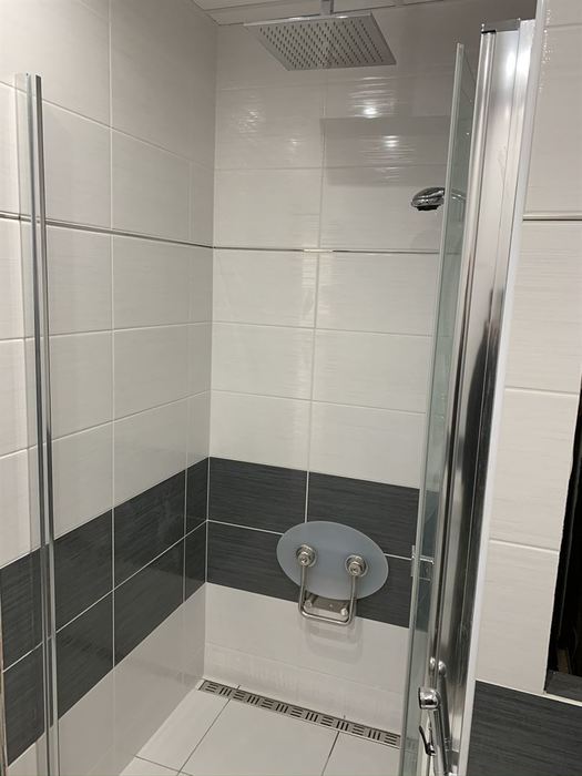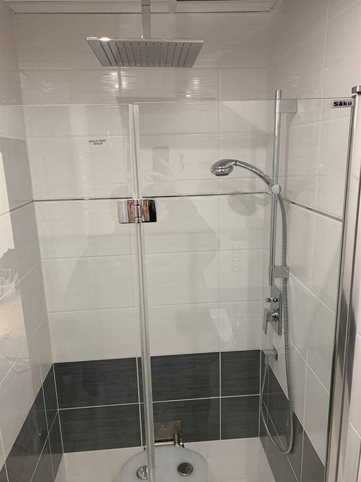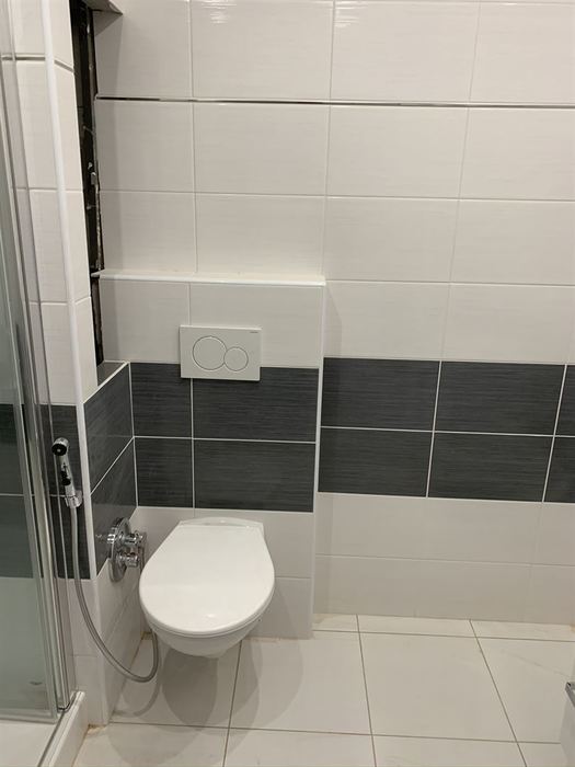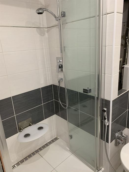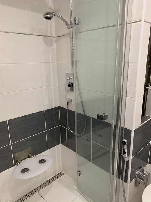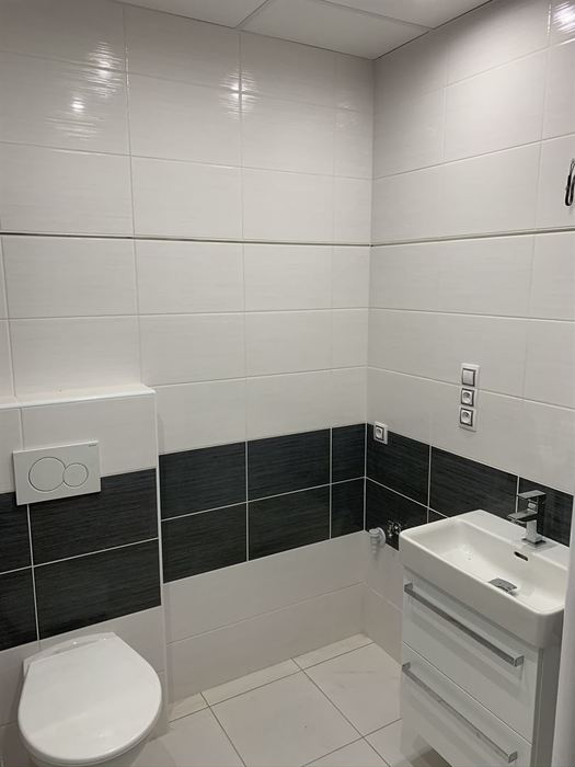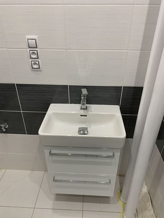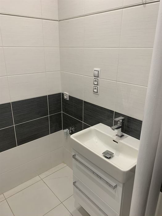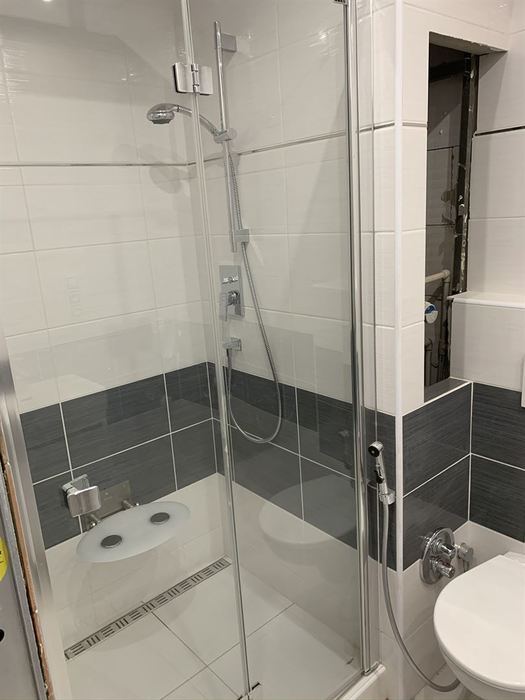 Původní jádro jsme odstranili a postavili jsme nové zděné bytové jádro se sprchovým koutem, závěsným WC Geberit, umyvadlem se skříňkou Krajcar. Součástí rekonstrukce je nová elektroinstalace, vodoistalace, odpady. Do koupelny je nainstalováno pouzdro pro posuvné dveře do stěny.