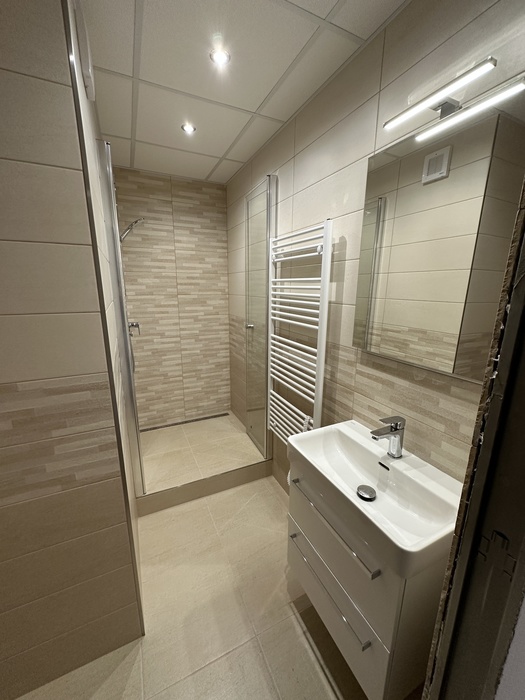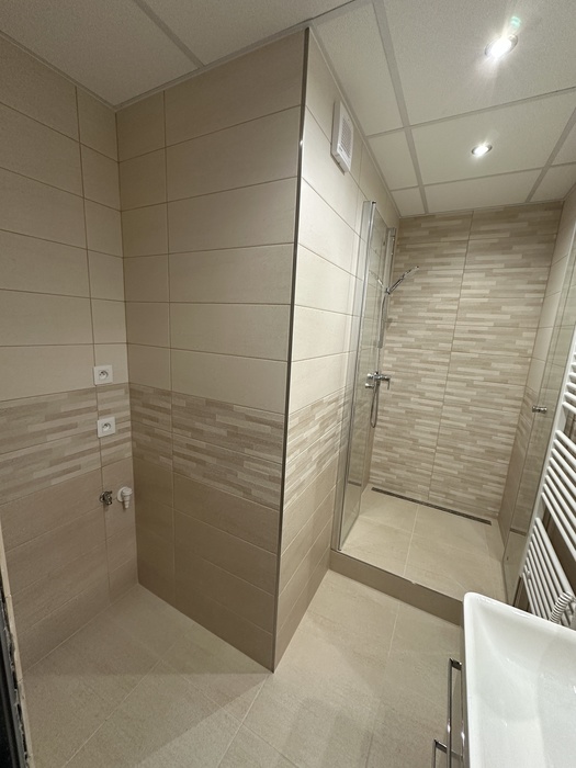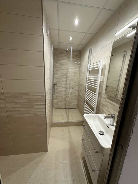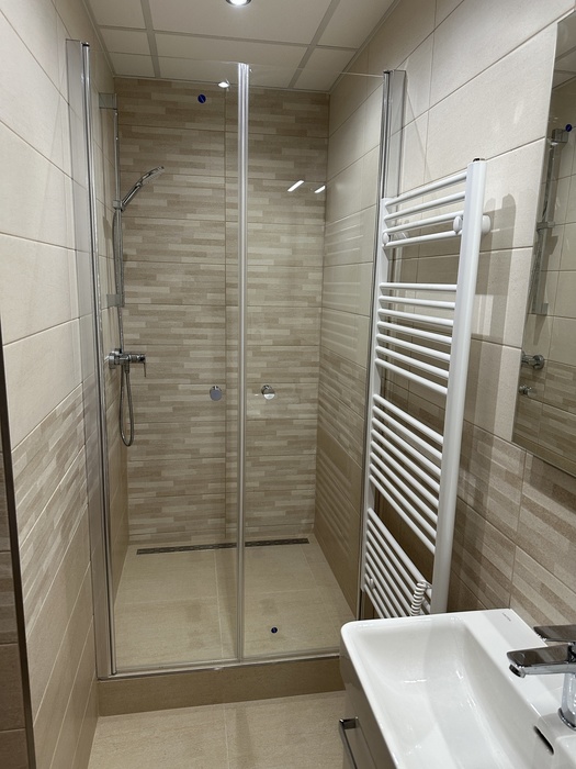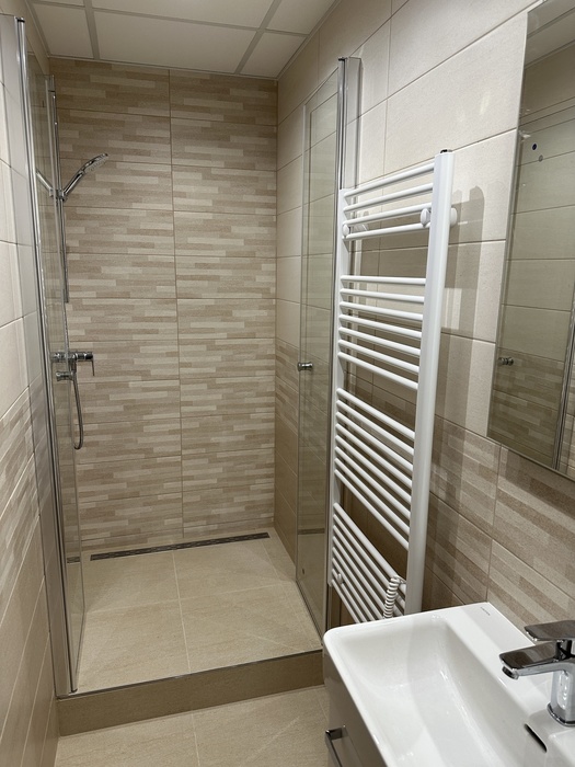 V Třebíčském paneláku jsme prováděli rekonstrukci bytového jádra a rekonstrukci elektroinstalace v celém bytě na klíč. Původní umakartové jádro jsme vybourali a na jeho místě jsme postavili nové zděné bytové jádro na klíč. Nové jádro je postaveno tak, aby v nově vzniklé koupelně mohl být velký sprchový kout o rozměru 100x100 cm. Nový sprchový kout má zděnou vaničku s celonerezovým odtokovým žlabem. Jsou osazeny vodovodní baterie od Novaservisu a koupelnový nábytek od firmy Krajcar. WC je v původním místě a je osazeno závěsným klozetem s konstrukcí od Geberitu a rohovým umyvátkem. V celém bytě byla provedena kompletní výměna rozvodů elektroinstalace. Následně byla nová elektroistalace zapravena a celý byt byl znovu vymalován.