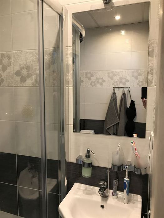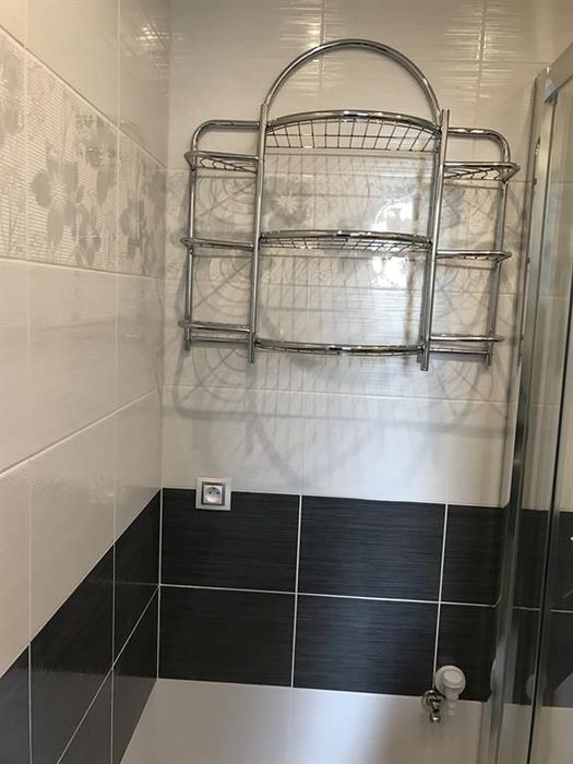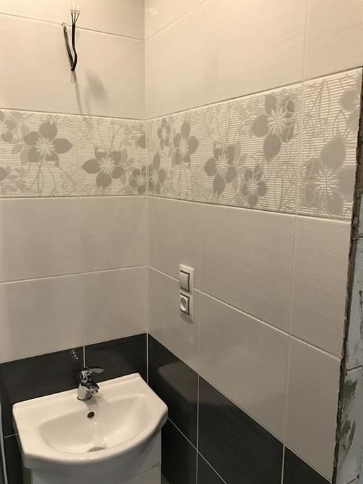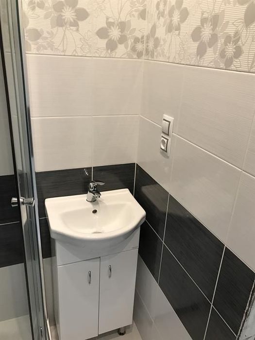 Rekonstrukce bytového jádra v panelovém domě na klíč. Pro tuto rekonstrukci byl použit obklad Calvano. Jsou zachovány původní rozměry bytového jádra. V koupelně je osazen sprchový skleněný kout s vaničkou z litého mramoru. Toto jádro je menšího rozměru (koupelna 160x130) a proto je použito umyvadlo se skříňkou o rozměru 45cm. Do WC je instalován vestavěný klozet s konstrukcí od výrobce Geberit.