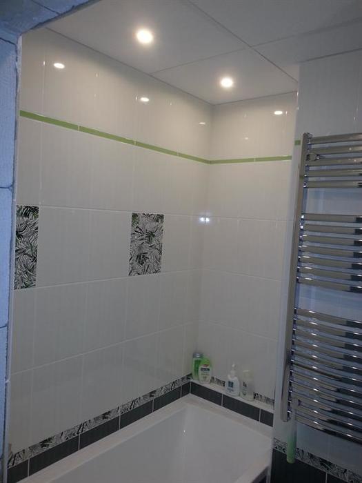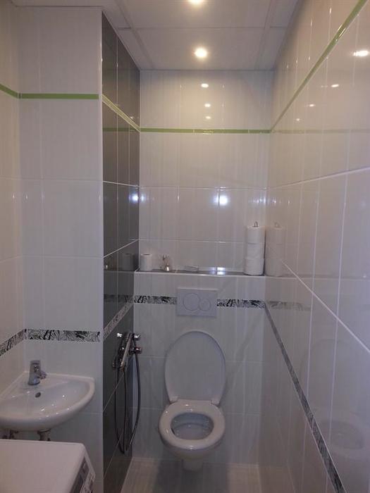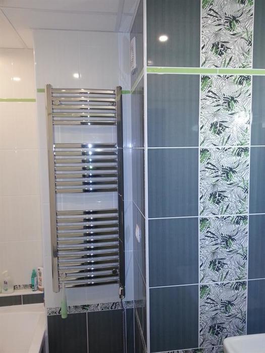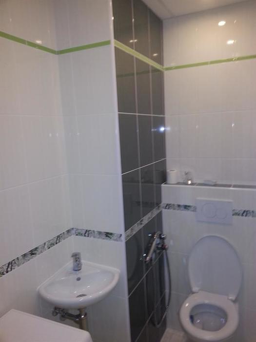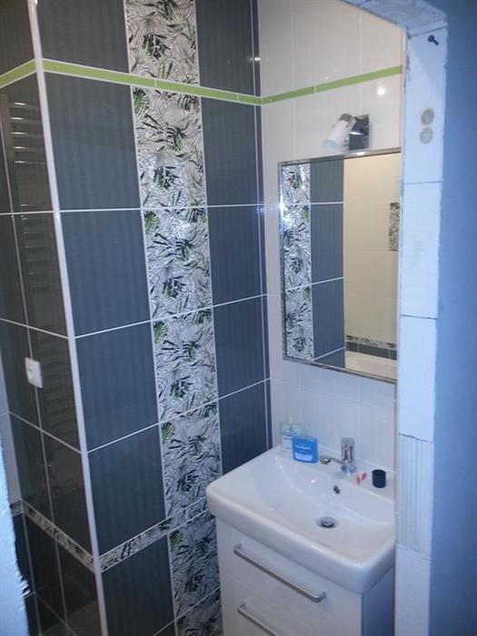 Rekonstrukce bytového jádra v panelovém domě. V bytě o velikosti 4+1 bylo vybouráno jádro a nová koupelna byla vystavěna z materiálu Ytong. Použitý obklad Hortensja se vyrábí ve dvou barevných variantách - šedá, zelená v kombinaci s bílou. V tomto případě byl použit šedý obklad s bílým. Povrch obkladů je ve vysokém lesku. V koupelně i na WC je proveden minerální strop s LED osvětlením. Je použita vana Spring. Konstrukce WC je značky Geberit.