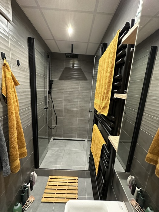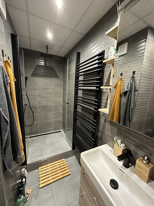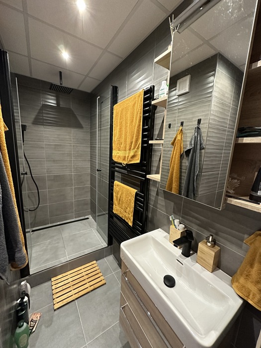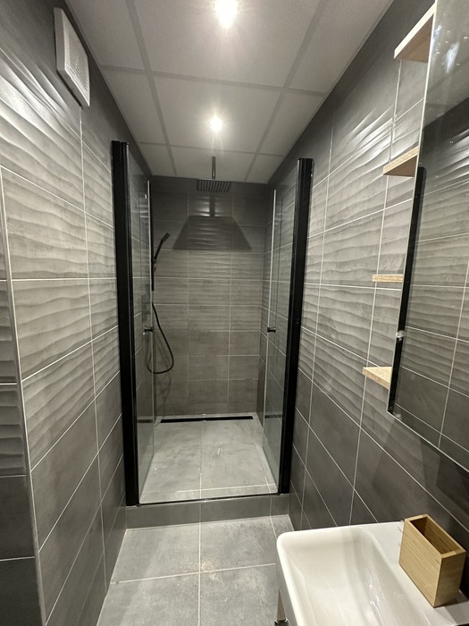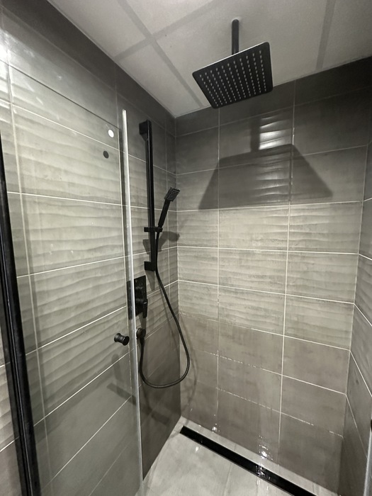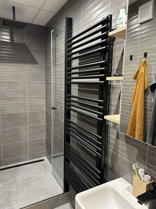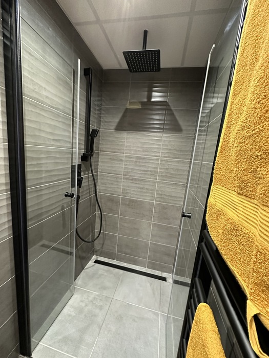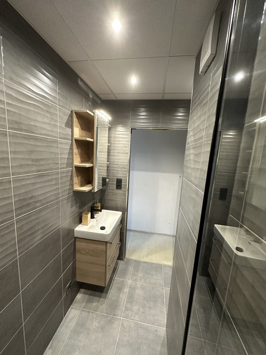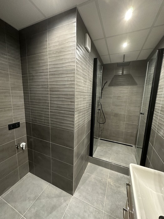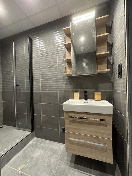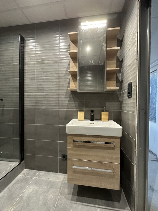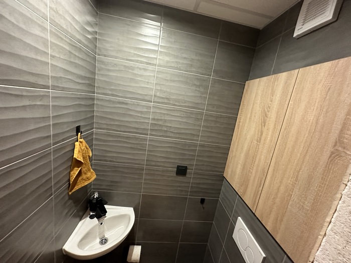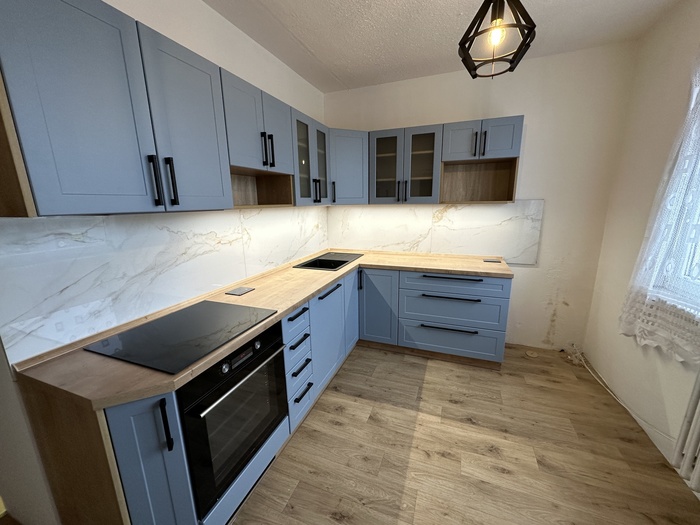 V Třebíči jsme prováděli rekonstrukci původního bytového jádra. Tato rekonstrukce včetně demolice původního umakartového jádra probíhala na klíč. Nová koupelna je v moderních barvách černé a šedě. Baterie od Novaservisu jsou v matné černé barvě. Obklad je v barvě šedé - jednobarevný. Sprchový kout se zděnou vaníčkou s odtokovým žlabem a pantovými dveřmi v provedení lítačky má černý rám. Do koupelny jsme osadili pouzdro do zdi pro dveře. Koupelnový nábytek Krajcar je v barvě dub sonoma. Součástí rekonstrukce bylo i obkložení kuchyňské linky velkoformátovým obkladem (120cm x 60cm). Zásuvky pracovní pro pracovní plochu kuchyňské linky jsou v pracovní desce (výklopné provedení).