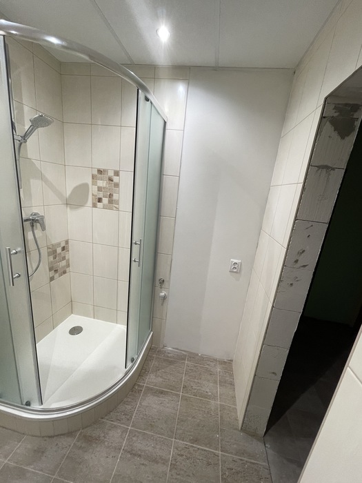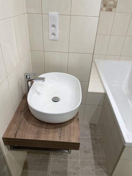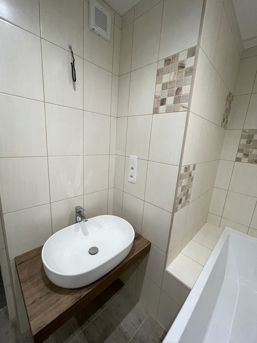V bytě 2+1 v panelovém domě jsme prováděli rekonstrukci bytového jádra na klíč. Původní umakartové jádro jsme vybourali a postavili novou zděnou koupelnu a wc. Nová koupelna a toaleta je postavena z Ytongových tvárnic. Nové zděné bytové jádro je zvětšeno přemístěno do chodby a části kuchyně a to z důvodů požadavku zákazníka, aby nová koupelna byla osazena jak vanou 170x70 a sprchový kout 90 čtvrtkruh. V koupelně je osazeno umyvadlo, které je nainstalováno na desce, dále je v koupelně příprava pro pračku a sušičku. V toaletě je osazen kombi klozet a umyvátko. Koupelna a wc jsou osazeny sníženým stropem s LED osvětlením.