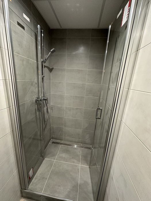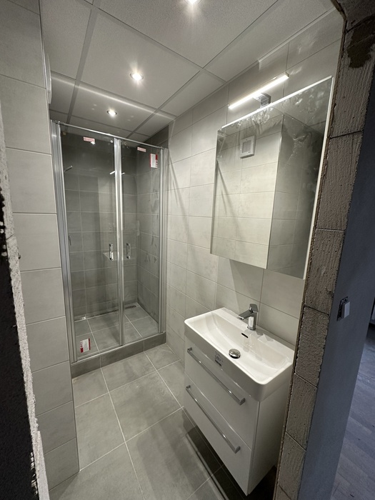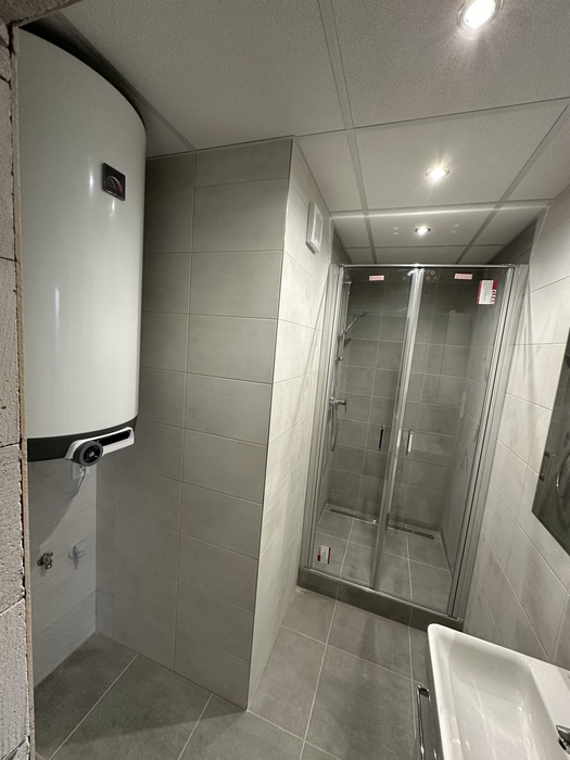 V bytě 2+1 v panelovém domě v Třebíči jsme prováděli rekonstrukci bytového jádra na klíč. Původní umakarové jádro jsme vybourali a postavili nové zděné bytové jádro se zděným sprchovým koutem s odtokovým nerezovým žlabem (podlouhlý kanálek do sprchy). V koupelně je nový sprchový kout 100x100 cm, který je osazen skleněnými dveřmi v provedení lítačky se vstupem středem. Nový koupenový nýbytek s umyvadke od firmy Krajcar. Nová koupelna je také osazena bojlerem Dražice, který bude zajišťovat ohřev vody pro koupelnu a kuchyň. Toaleta je osazena wc kombi Jika Lyra a uyvátkem. Součástí této zakázky byla také nová elektroinstalace v pokojích.