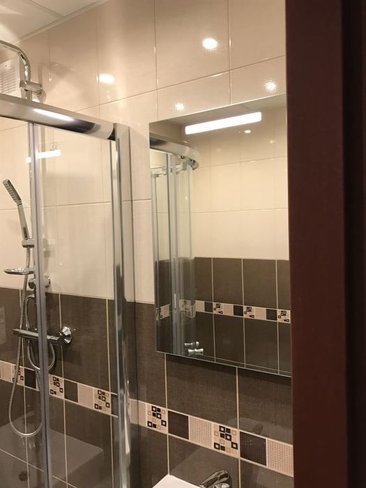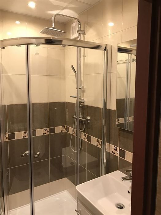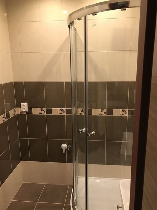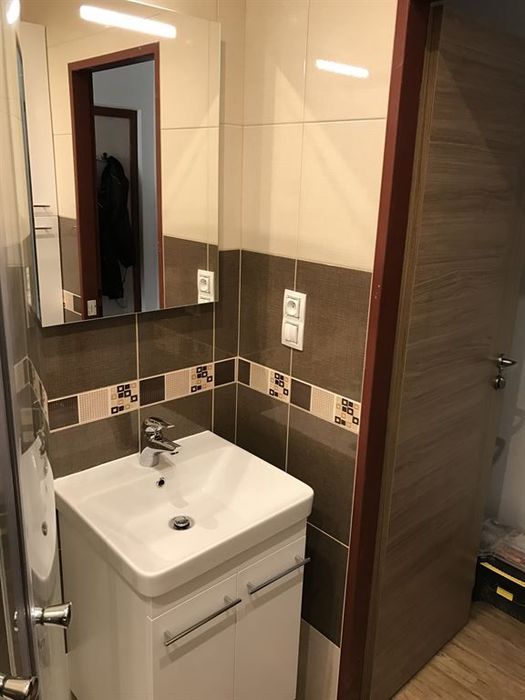 Rekonstrukce bytového jádra v panelovém domě. Koupelna je o 20 cm zvětšena než původní koupelna v jádře. Do nové koupelny jsme instalovali sprchový kout se skleněnou zástěnou a sprchovou vaničkou z litého mramoru. Sprchový kout je osazen nadomítkovým sprchovým setem s hlavovou a ruční sprchou. Umyvadlo s nábytkem a koupelnová skříňka závěsná od českého výrovce Krajcar. WC je osazeno konstrukcí Geberit se závěsným WC. Instalováno je LED bodové osvětlení. Součástí rekonstrukce byla nová elektroinstalace celého bytu 2+1.