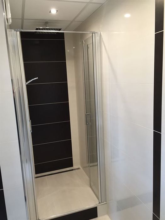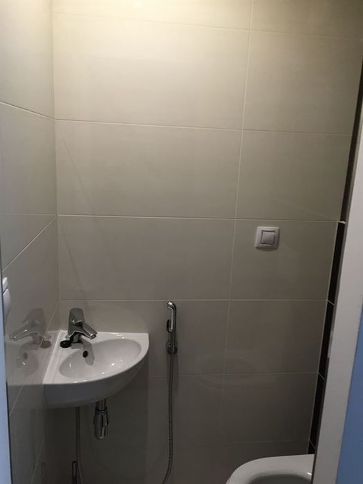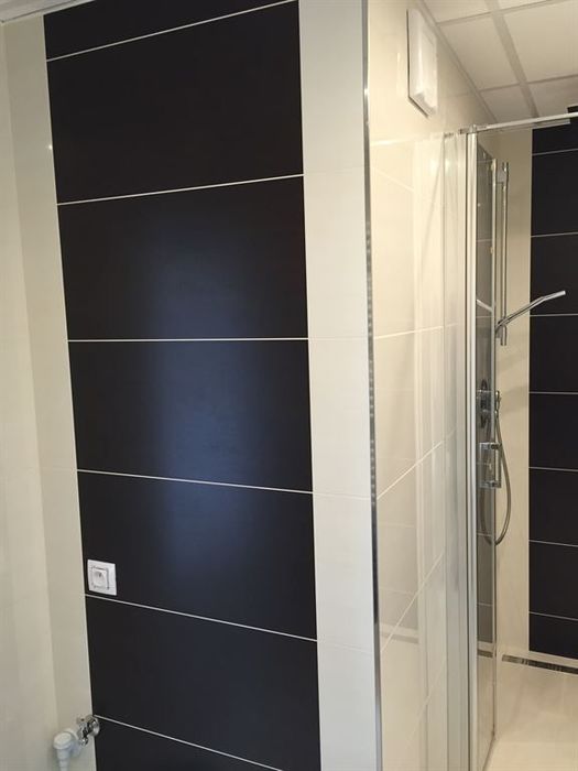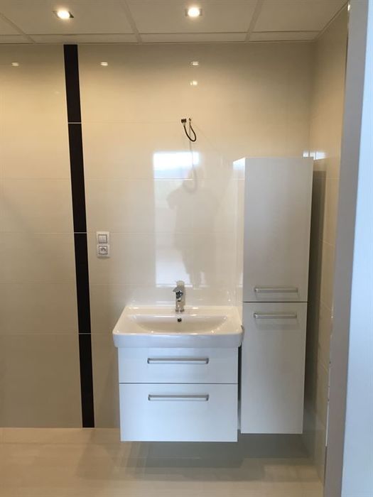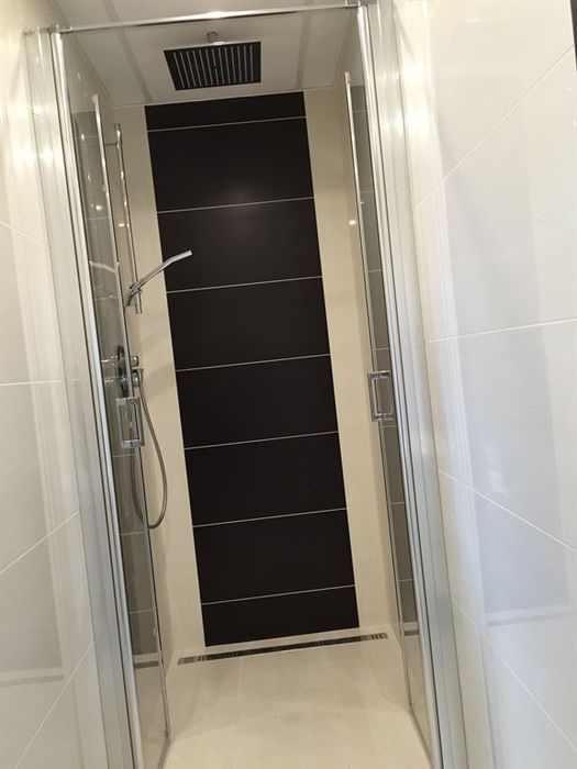 Původní bytové jádro bylo odstraněno. Nové bytové jádro je rozšířeno a je postaveno z Ytongových tvárnic pro přesné zdění. Do nové koupelny je postaven sprchová kout se zděnou vaničkou, odtokovým žlabem, termostatickou baterií (provedení podomítkové s ruční a hlavovou sprchou) a skleněnými dveřmi provedení lítačky. Dále je nainstalován koupelnový nábytek od Dřevojasu. Velkoformátový obklad Travena je ve světlém provedení ve vysokém lesku a v tmavém je mat. Součástí koupelny je elektrický topný žebřík a příprava pro pračku i sušičku. V novém WC je namontovaná samonosná konstrukce Geberit se závěsným klozetem a rohové umývátko s baterií s bidetovou sprškou. Baterie v koupelně jsme použili od Novaservisu. Součástí rekonstrukce bytového jádra byly veškeré práce včetně řemesel. Prováděli jsme také zapojení nové kuchyňské linky.