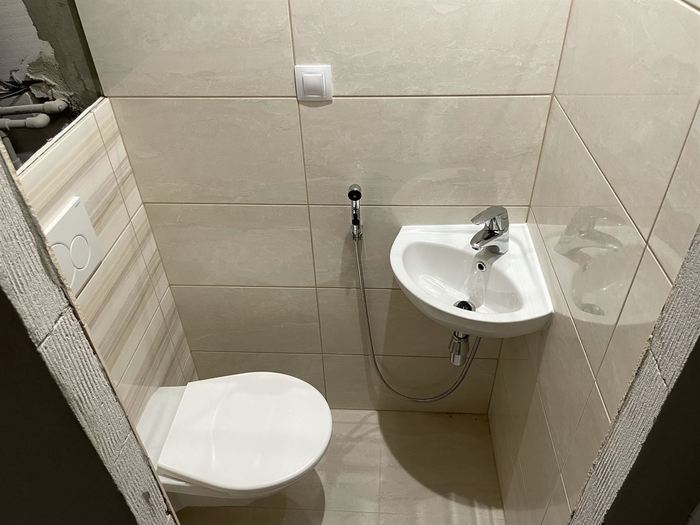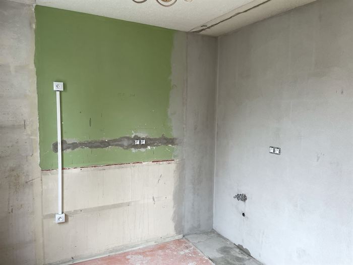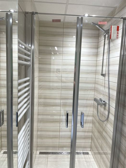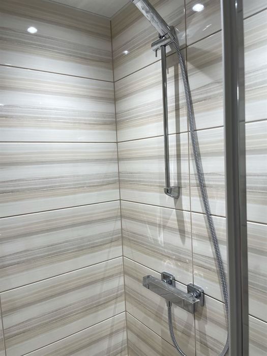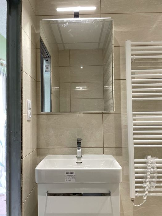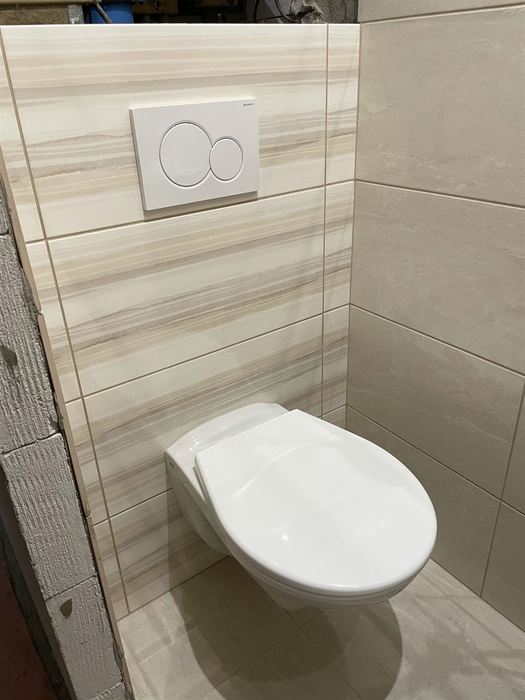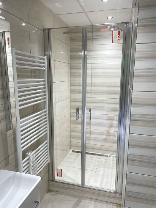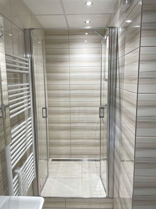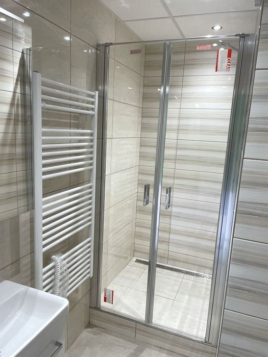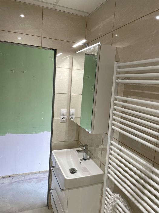V bytě 3+1 jsme odstranili původní umakartové bytové jádro. Změnou tvaru koupelny jsme dosáhli, že koupelna má zděný sprchový kout 100x100 cm a nová kuchyň bude ve tvaru L. Sprchový kout je osazen nerezovým odtokovým žlabem a skleněné dvoukřídlé dveře jsou v provedení "lítačky" (otevírání vni x vně). Koupelna je dále osazena el. topným žebříkem, umyvadlem s nábytkem od výrobce krajcar včetně zrcadlové skříňky s LED osvětlení, vodovodní bateriemi jsou od Novaservisu. WC je osazeno závěsnou konstrukci od Geberitu a rohovým umývátkem.