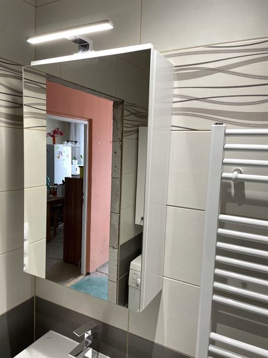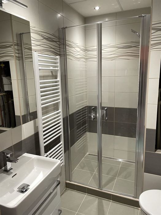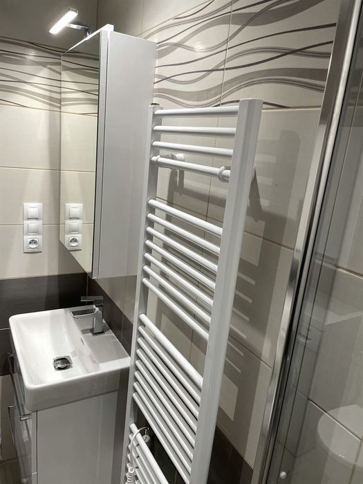 V bytě 1+1 jsme prováděli rekonstrukci původního umakartového jádra, které bylo demontováno a na jeho místě jsme postavili v původních rozměrech nové bytové jádro. V nové koupelně je zděný sprchový kout s odtokovým žlabem a sprchovými dveřmi v provedení lítačky se středovým vstupem, koupelnové baterie od Novaservisu, nábytek od firmy Krajcar, el. topný žebřík a kombi klozet Jika.