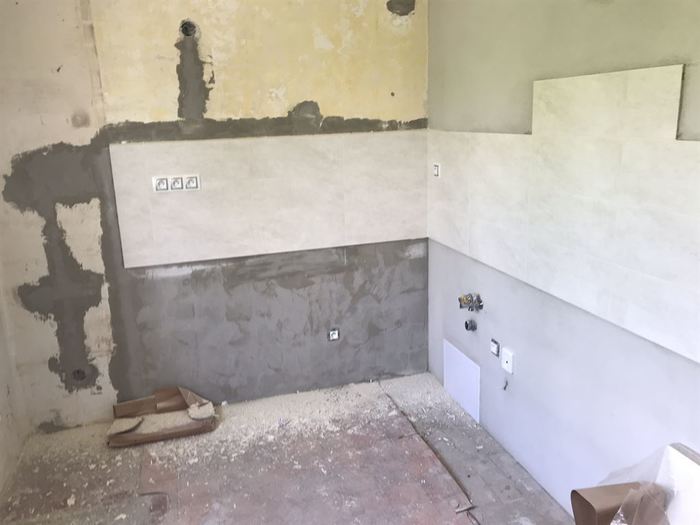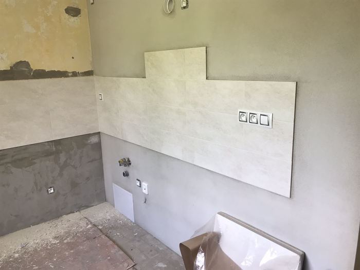 V cihlovém činžovním domě jsme prováděli rekonstrukci bytového jádra. Původní jádro i s cihlovou čelní stěnou bylo odstraněno a vyzděno z Ytongů. V těchto bytech je jádro menší a proto jsme koupelnu spojili s WC a dispozičně změnili. Tím jsme dosáhli velkého sprchového koutu s odtokovým žlabem a dveřmi lítačky. WC konstrukci jsme použili Geberit na zazdění. Pod závěsnou skříňkou bude umístěna pračka. Obklad koupelny je od Cerrolu v provedení bílá/šedá a moderní dekor. Součástí rekonstrukce je nová elektroinstalace a vodoinstalace.