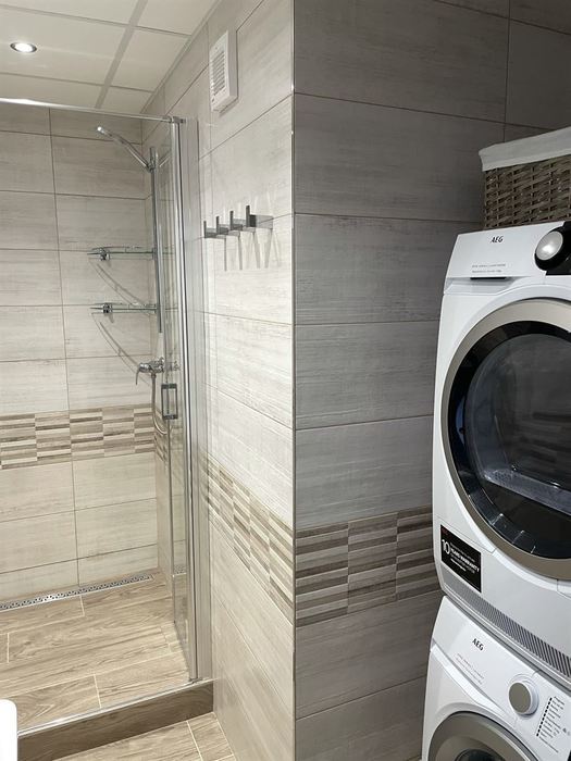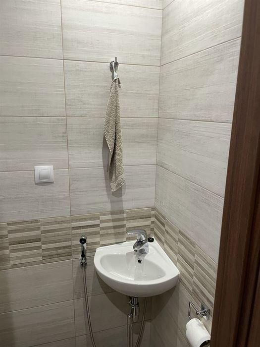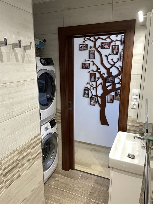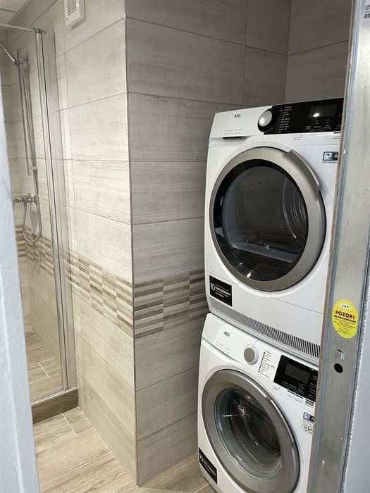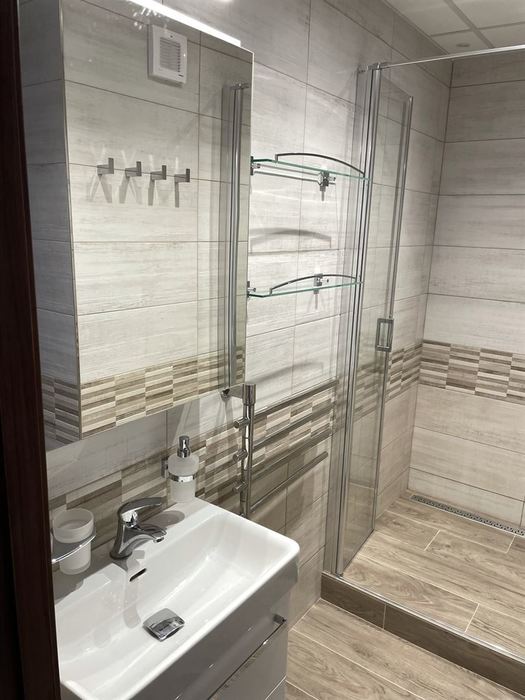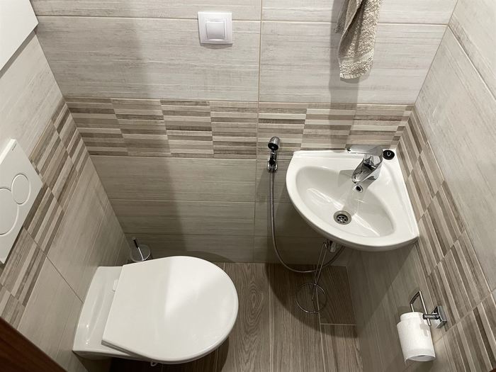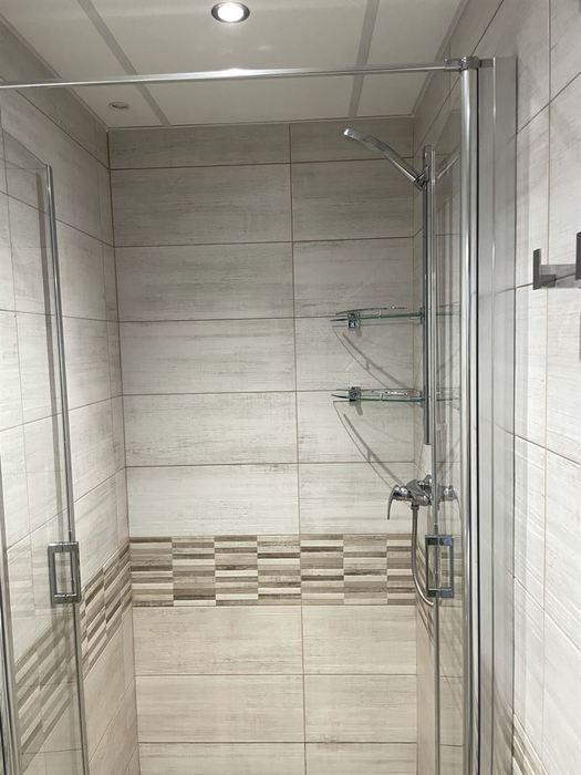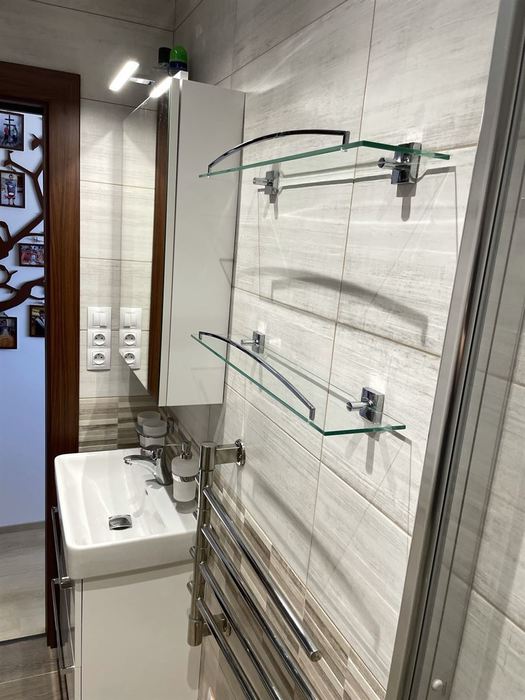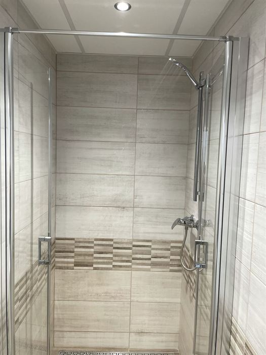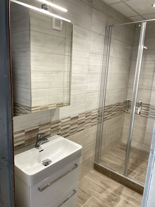 V bytě 3+1 v paneláku jsme prováděli demolici původního umakartového jádra a výstavku nového zděného jádra se sprchovým koutem, který je osazen zděnou sprchovou vaničkou s odtokovým žlabem a skleněnými dveřmi v provedení "lítačky" - vstup středem. Koupelna i WC je osazena bateriemi od Novaservisu. Koupelnový nábytek od firmy Krajcar. Toaleta je osazena závěsným WC s konstrukcí Geberit a rohovým umývátkem. Součástí rekonstrukce byla dodávka všech řemesel na klíč.
