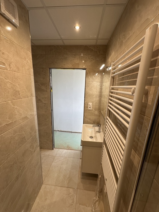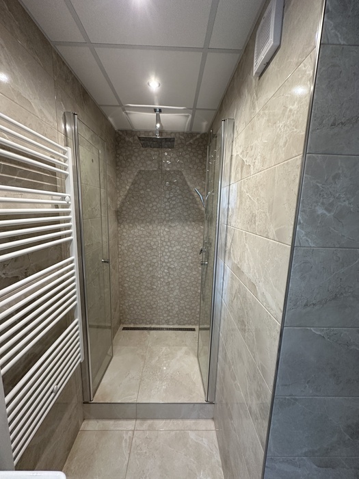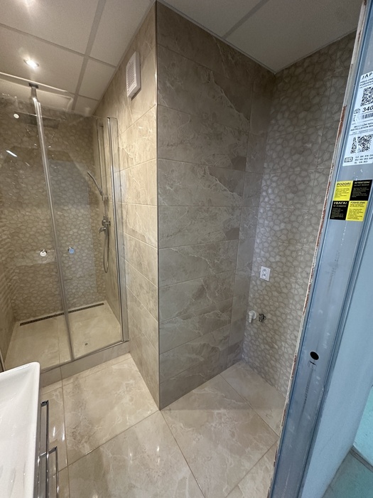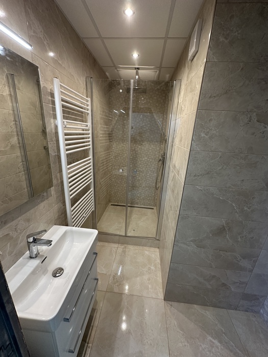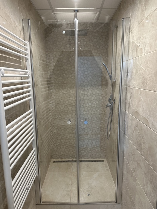 V paneláku v bytě o velikosti 3+1 jsme prováděli rekonstukci interiéru bytu a bytového jádra na klíč. Původní umakartové jádro jsme vybourali a postavili nové zděné bytové jádro tak, aby v nově vzniklé koupelně mohl být sprchový kout 100x100cm se zděnou vaničkou a nerezovým odtokovým žlabem. Namontované sprchové dveře jsou od výrobce Ronal a jsou v provedení lítačky - otevírání vni / vně (dvoukřídlé provedení se vstupem středem). V koupelně je namontován koupelnový nábytek od českého výrobce Krajcar. Vodovodní byterie na umyvadle, ve sprchovém koutě a na wc (baterie s bidetovou sprškou) jsou od českého výrobce Novaservis. Konstrukce závěsného wc je od firmy Geberit a je na ní osazen záchod od české JIKY.