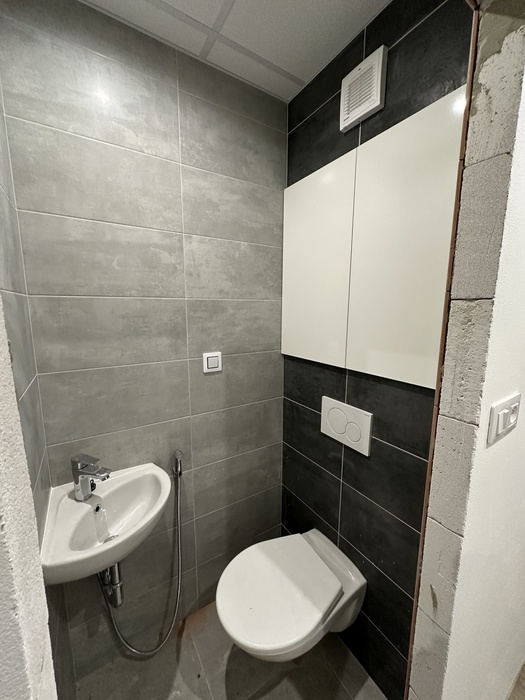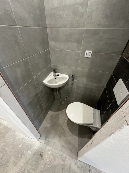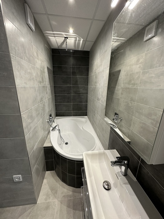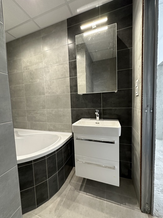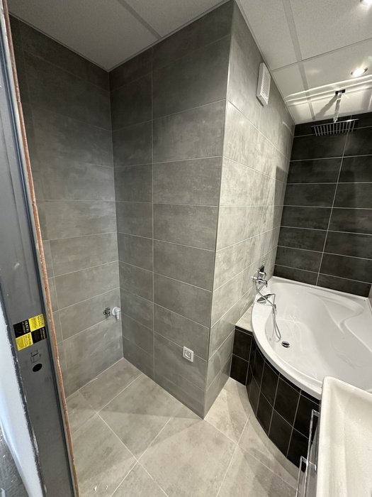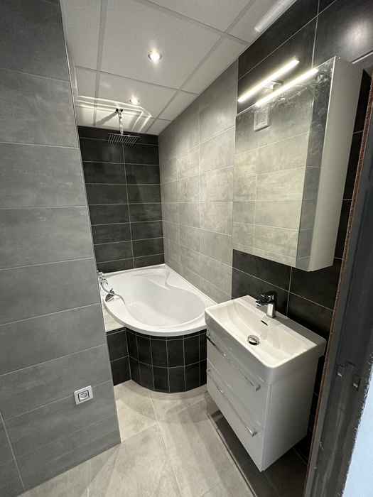 V panelovém domě jsme prováděli rekonstrukci interiéru bytu na klíč včetně rekonstrukce bytového jádra. Tato rekonstukce probíhlala od A do Z. Od demoličních prací včetně vyklizení a odvozu odpadů a ž po předání zákazníkovi. Původní umakartové jádro bylo odstraněno a provedli jsme výstavbu nové koupelny s vanou Rosa. Koupelna je obložena moderním šedým obkladem dle 3D vizualizace. V pokojích byla provedena oprava omítek a nová výmalba.