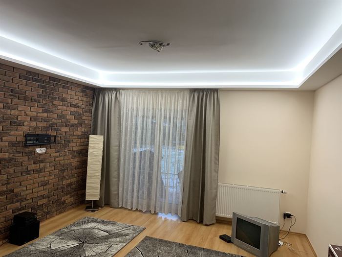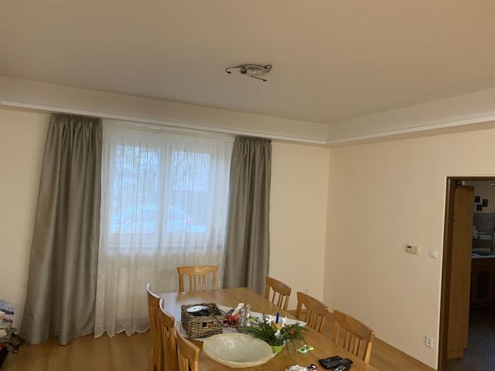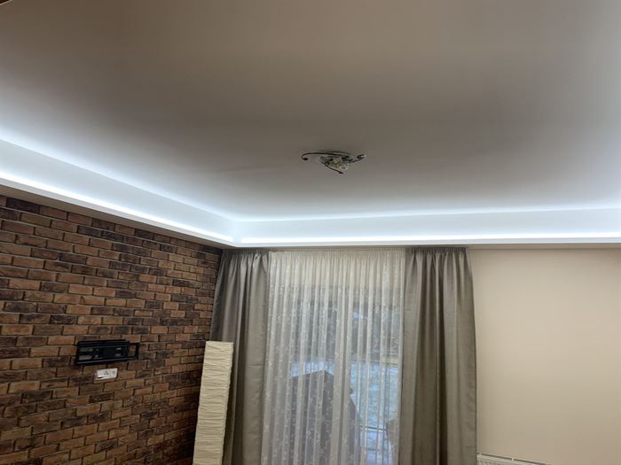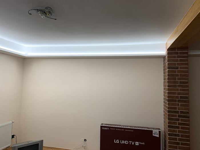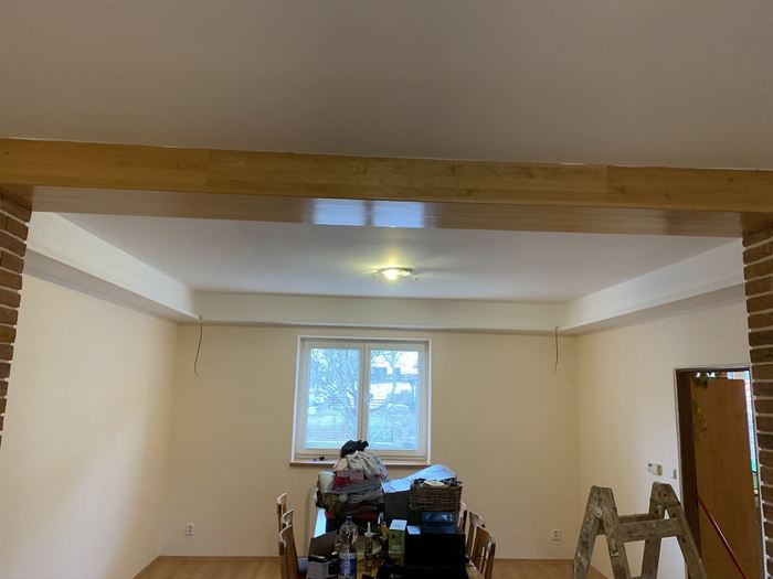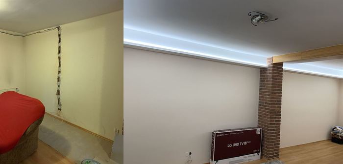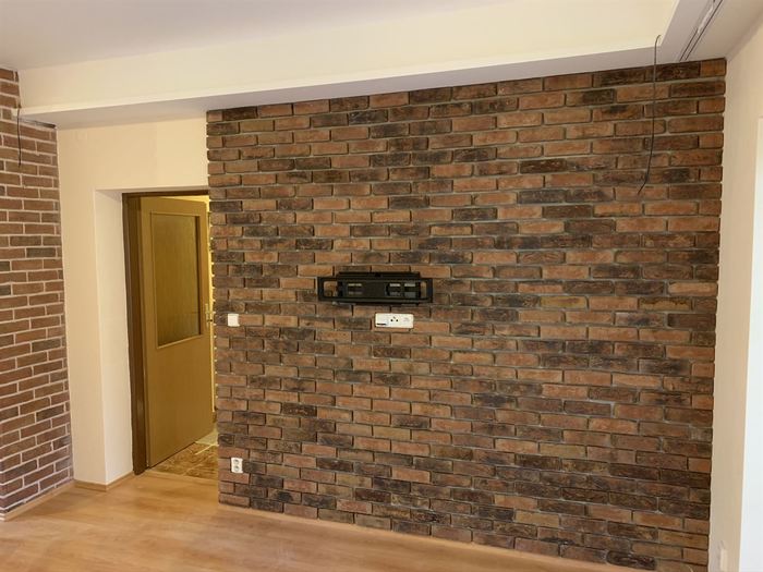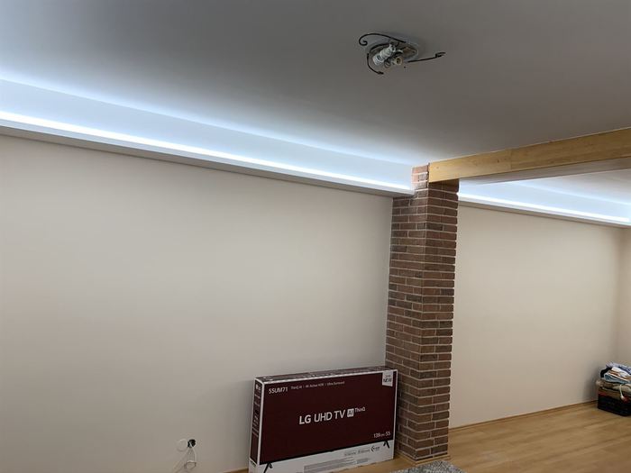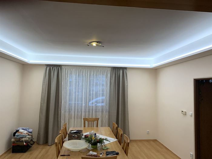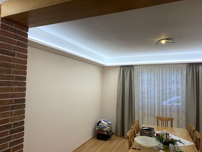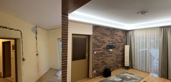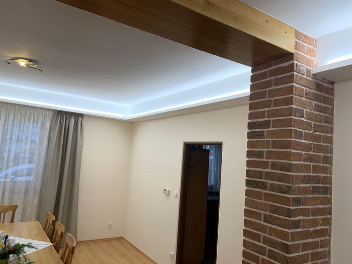 Rekonstrukce obývacího pokoje a jídelny v rodinném domě. Provedli jsme předělání elektroinstalace pro TV na protější zeď. V obou místnostech jsme ze sádrokartonu namontovali podhled s přípravou pro led osvětlení, které jsme pak do podhledu nainstalovali. Na televizní stěnu jsme obložili dekorativní obklad s motivem cihliček, kde je i držák pro zavěšení TV. Součástí zakázky byly zednické, obkladačské a elektroinstalatérské práce.