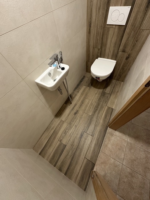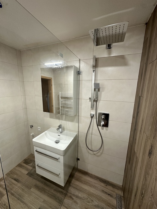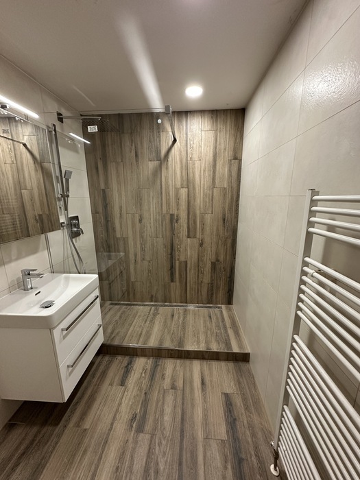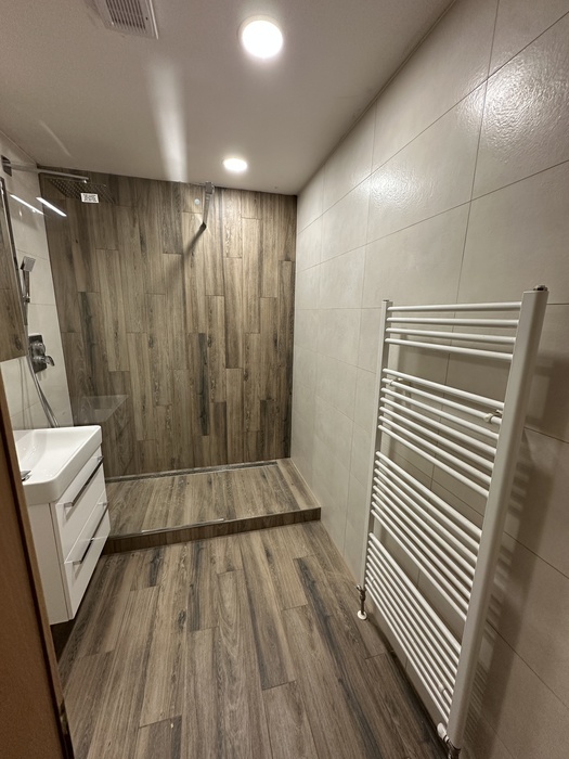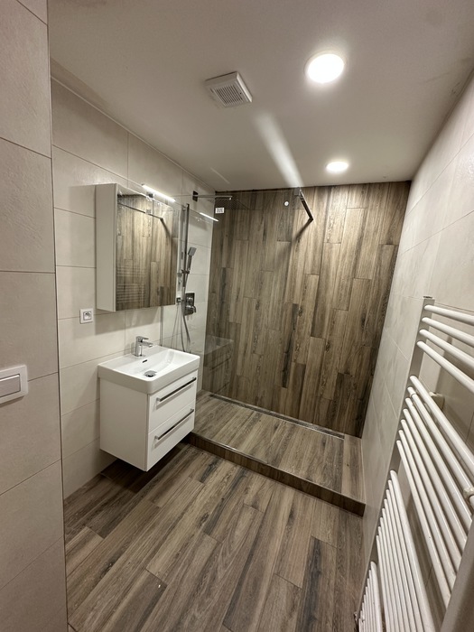 V cihlovém činžáku, který se nachází v Třebíči na kopcích jsme prováděli rekonstrukci koupelny a wc. Původní prostory koupelny a wc byly vybourány. Osekané stěny od obkladů jsme znovu vyrovnali, provedli jsme hydroizolační nátěry a podlahu jsme vyrovnali nivelační stěrkou. Na místě, kde původně byla vana, jsme zvedli podlahu a vytvořili schodek ve kterém je nerezový odtokový žlab, na schodku stojí walk-in stěna, která odděluje sprchový kout od koupelny. V koupelně je osazen koupelnový nábytek od firmy Krajcar, vodovodní baterie od Novaservisu a topný žebřík napojený na ústřední vytápění. WC je osazeno závěsným záchodem s konstrukcí od Geberitu a úzkým rovným umyvátkem.