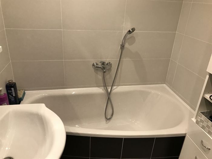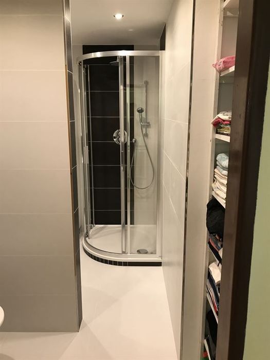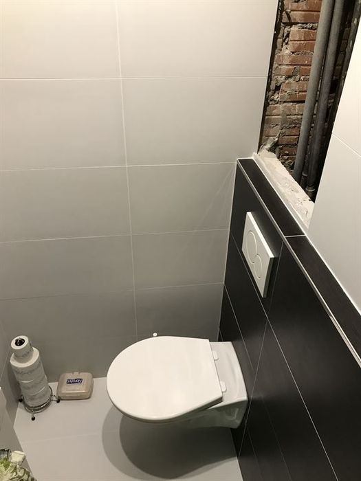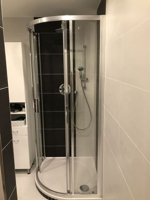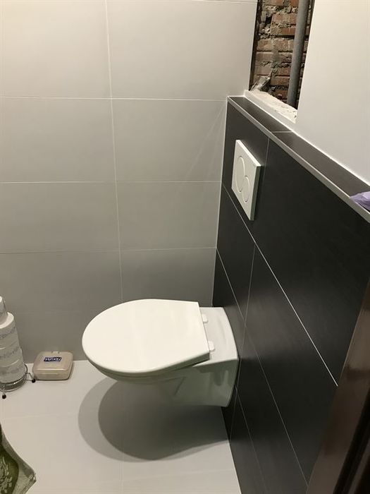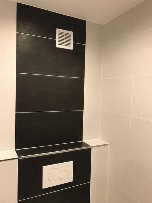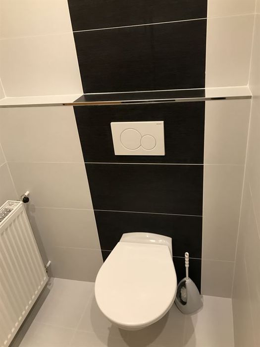 Rekonstrukce koupelny a WC v řadovém rodinném domě. V 1NP se nachází samostatné WC se závěsným umývátkem se skříňkou. Ve 2NP se nachází koupelna s WC, vanou od českého Santechu, sprchovým koutem Ronal, umyvadlem se skříňkou. Oba nové závěsné záchody jsou s konstrukcí Geberit. Sprchový kout je osazený vaničkou z litého mramoru a prosklenou sprchovou zástěnou. Obklad je zvolen v černo bílé nadčasové kombinaci. Součástí rekonstrukce byla kompletní výměna rozvodů vodoinstalace v domě a nutné úpravy elektroinstalace v koupelně včetně montáže bodového osvětlení v koupelně i WC, veškeré zednické i obkladačské práce.
