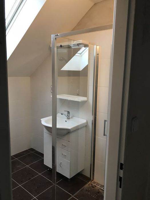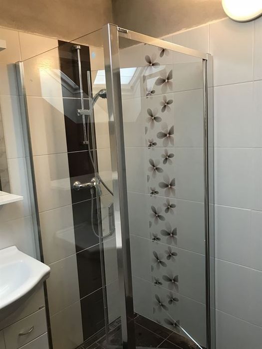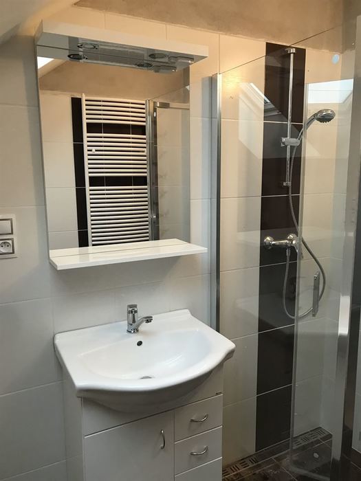 Rekonstrukce koupelny a WC v RD na Třebíčsku. Původní WC a koupelna byla odstraněna včetně původní plechové vany. V nové koupelně je nainstalován bezbariérový sprchový kout se zapuštěným odtokovým žlabem. Sprchové dveře s pevnou boční stěnou jsou v provedení lítačky. Součástí rekonstrukce byly nové rozvody vodoinstalace, částečná rekonstrukce topení v provedení CU. Původní záchod byl odstraněn a na jeho místě jsme zabudovali konstrukci Geberit se závěsný WC.